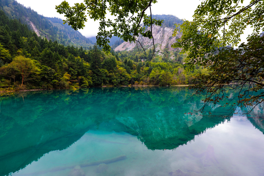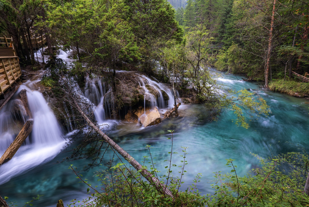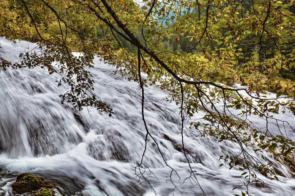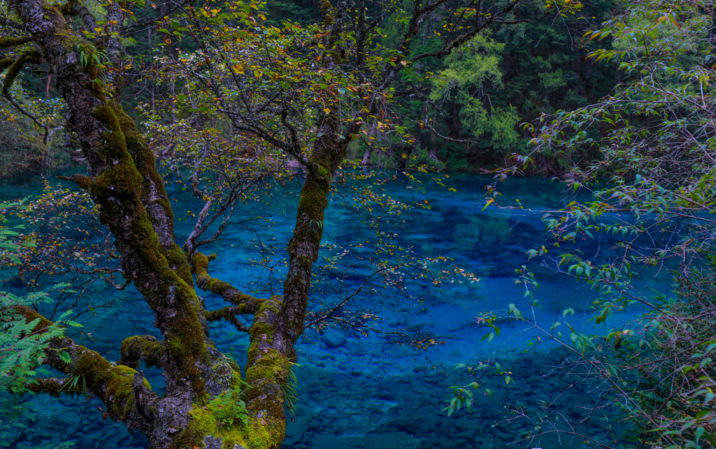 九寨的水,是色彩斑斓的,掩映在苍翠欲滴的浓荫之中,五色的海子,流水梳理着翠绿的树枝和水草,与岸边倒影火花映衬,温柔的风吹拂着每一颗树梢,就像流水一般的自由闲适,这里的山与树、水与天组合成了一幅巨大的美丽画卷,让我沉迷。