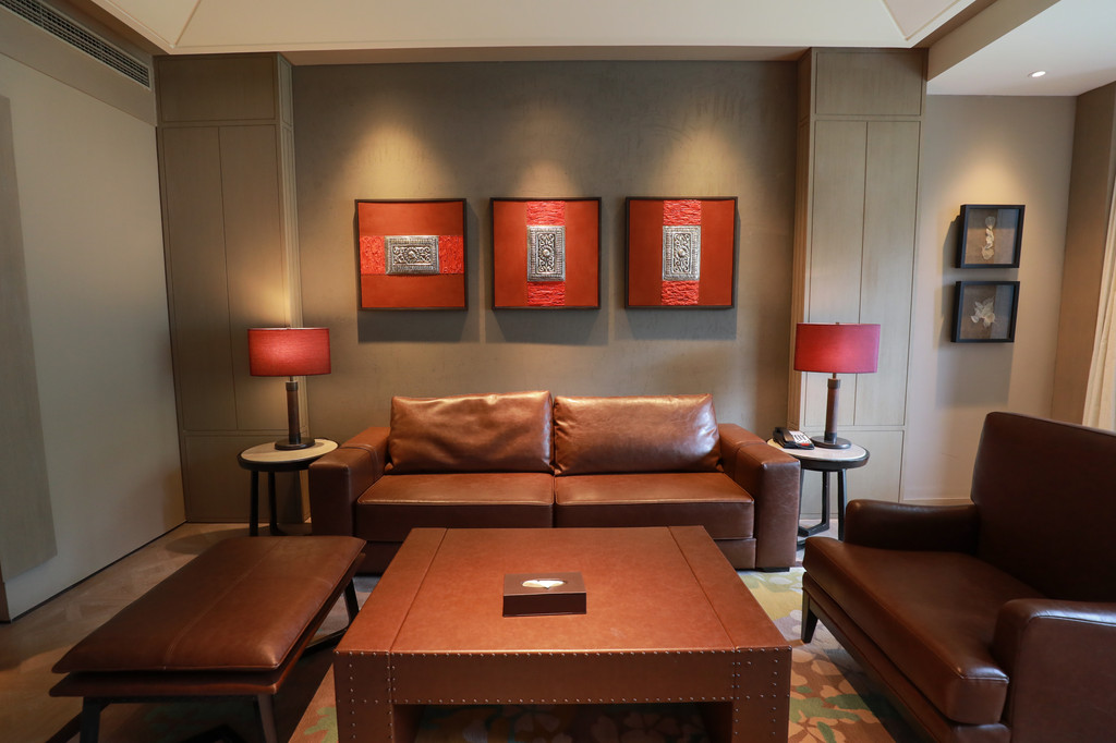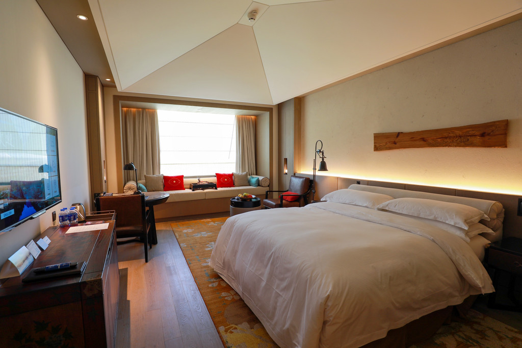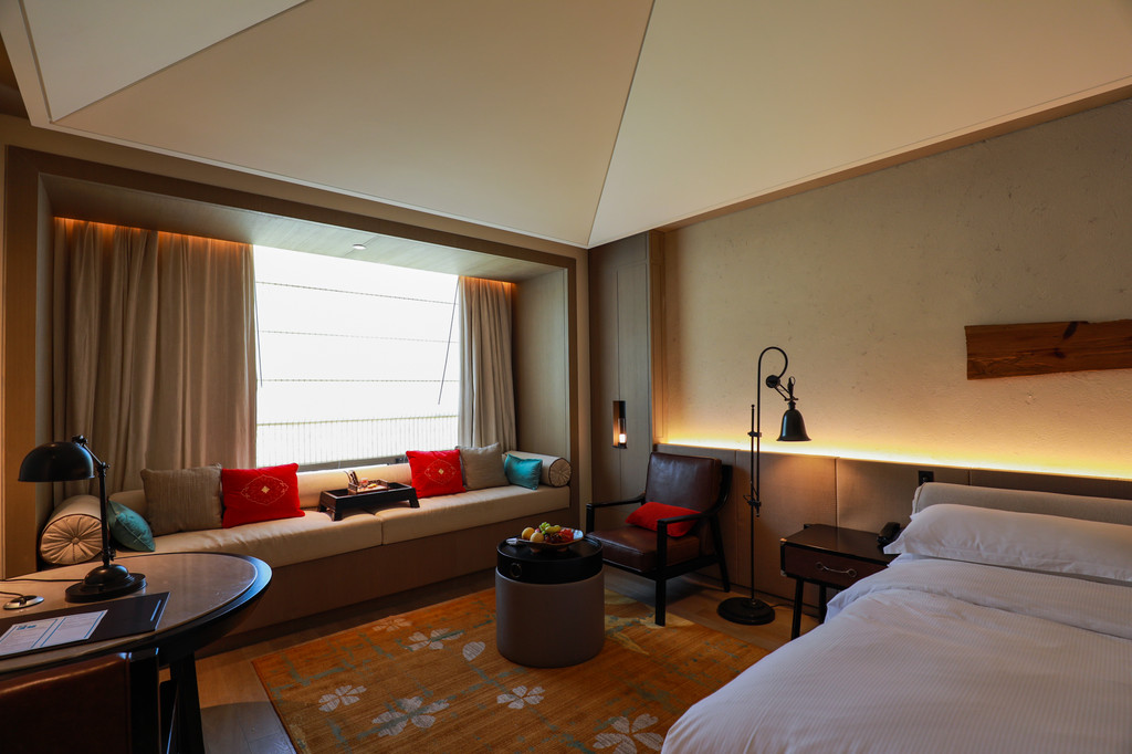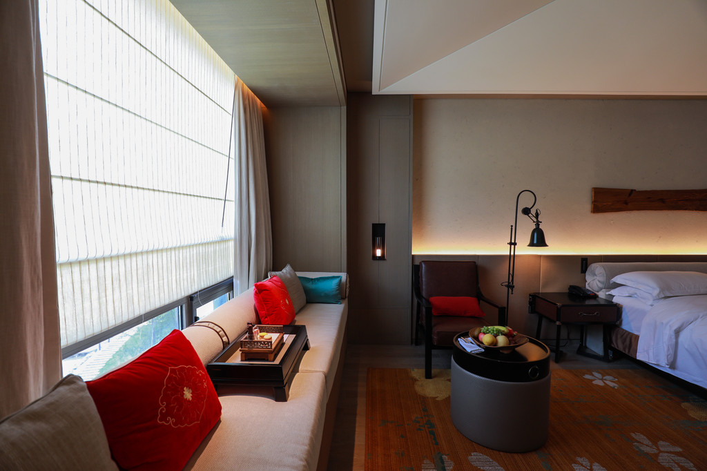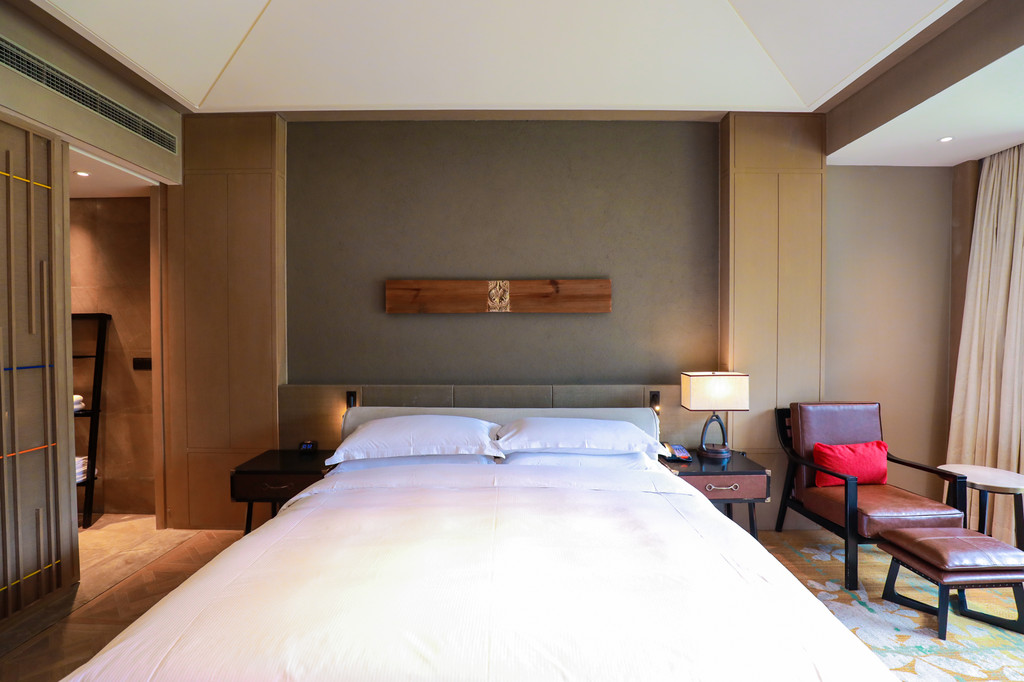 客房内的每一个角落都给人一种不拖沓的沉稳美感,家具用品的选择都很有品味,柔软的枕被,舒服的沙发,还有精致小巧的装饰用品,特别喜欢床后靠背的设计,高度十分合理,这样躺在床上看手机电脑都不会感觉累,床边还有躺倚的设计,累了可以小憩一会,贴心的酒店,还提前准备了新鲜的水果和甜点饮料迎接客人。