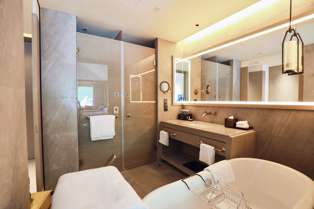 洗漱区和休息区是用可推拉的木门设计隔开,整体宽敞、明亮我很喜欢,卫浴用品选用都是五星级高端产品,简约中透着一种大气,浴室和卫生间都是独立的与洗漱台干湿分离,两人同时使用不用担心会相互干扰。最值得一提的是淋浴间的开关处,有使用文字提示,虽然是一处小小的细节,但无不透露出酒店的用心细致。