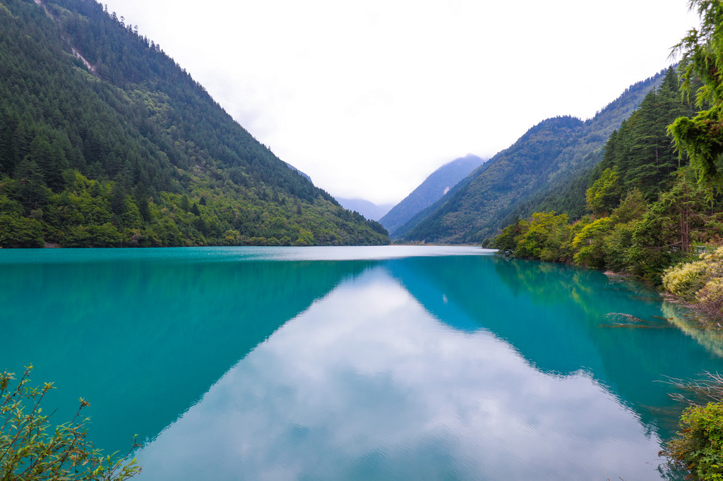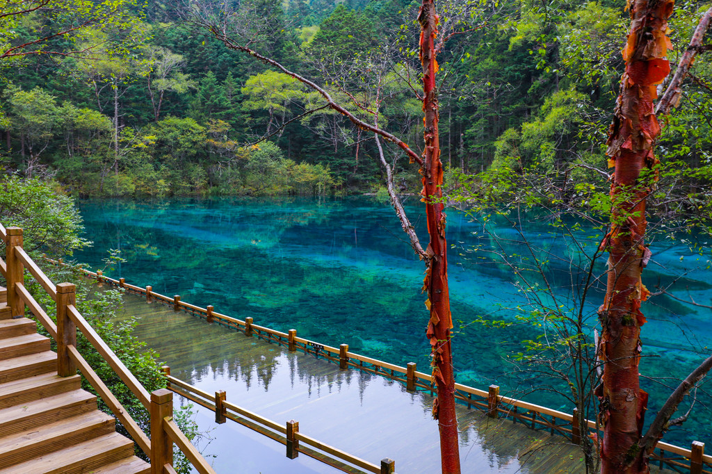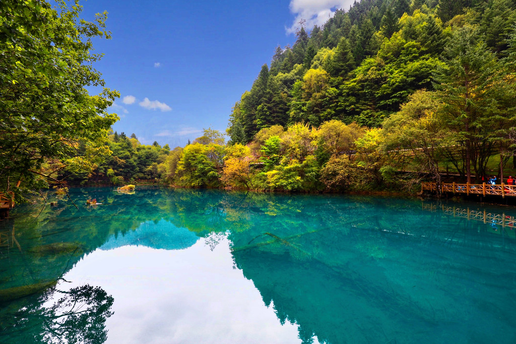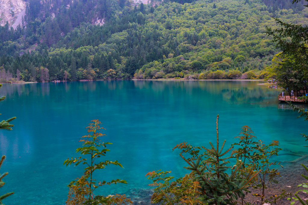 行至最高点五花海,也是九寨沟里最美的湖泊,湖面水波不兴,宁静祥和,像一块光滑平整、晶莹剔透的绿宝石,四周长满了各色花草树木,初秋的季节,一片淡黄,秋风起时,必是满堤红叶绿树倒影于湖光山色之中,美不胜收。