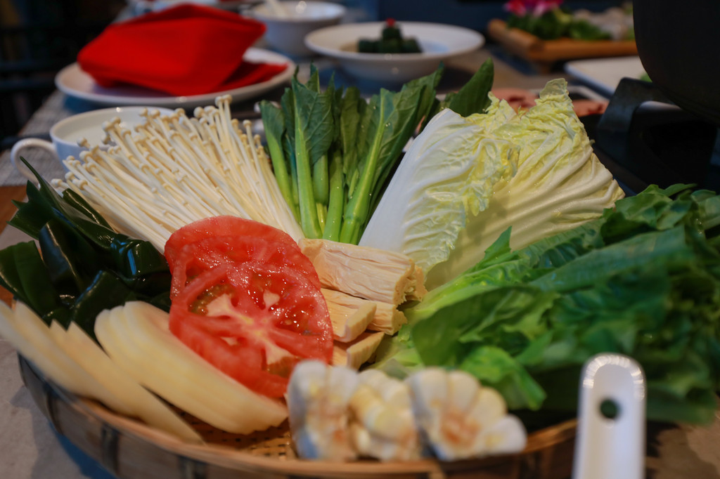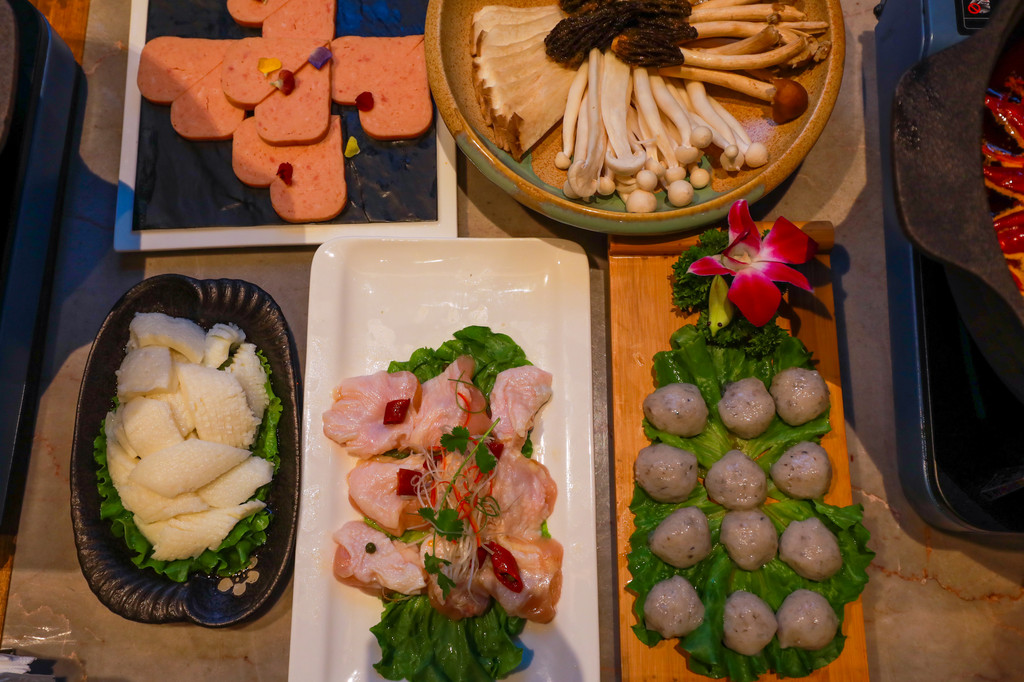 满满的一桌看得我们只想赶紧开火烫菜,虽说是酒店里的火锅,但是菜品和味道却一点也不逊色,餐厅的食材都非常新鲜,肉片的色泽鲜红透亮,看着就很有食欲,火锅店里的招牌菜硬菜,这里都能吃到!