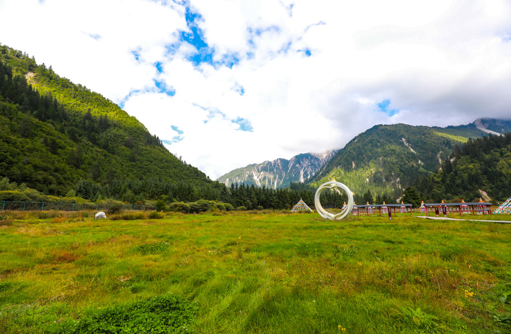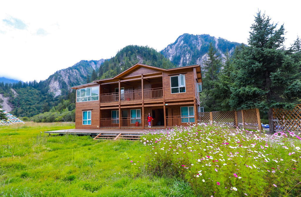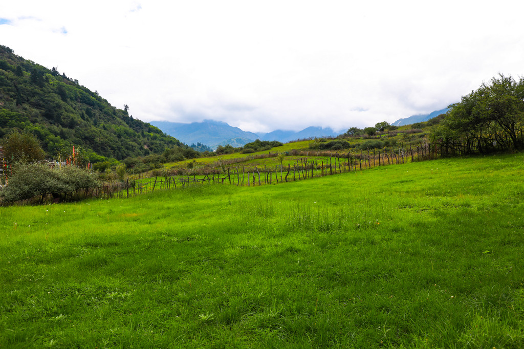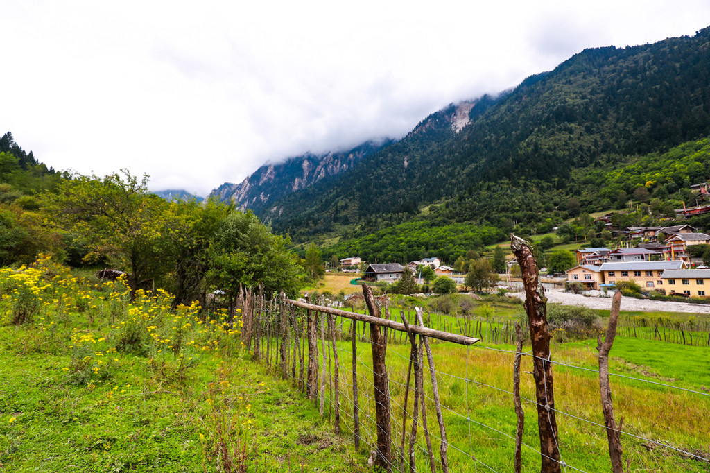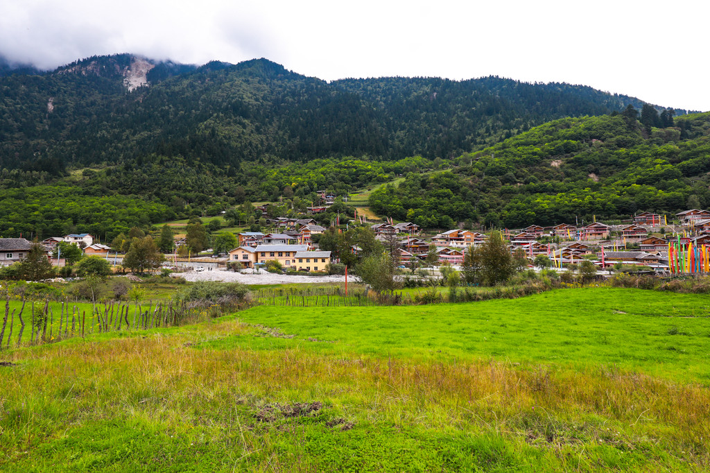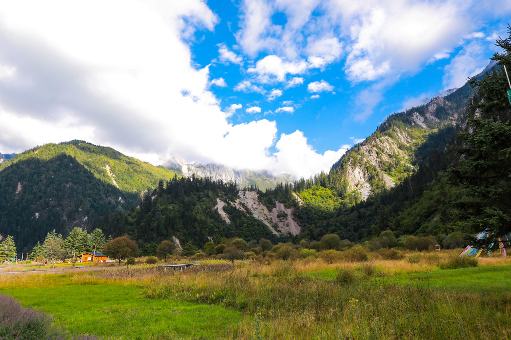 静静的躺在这里,看尽九寨的繁华,村头路上散落的马粪,随风轻轻摇摆的隆达!山坡上的谷地里铺陈着一望无际的草地,四周簇拥着高山灌木和针叶,由近及远地呈现出翠绿、黛青和蔚蓝色,映衬着远处巍峨雄伟的雪山,仿佛置身在瑞士童话里的小村庄一般。