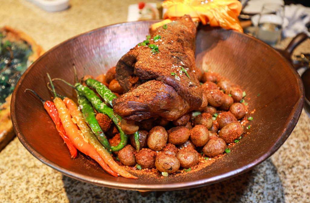 藏香风味烤羊腿,精选当地山羊肉配上小土豆,烤出来的羊腿皮薄且酥脆,肉嫩又带有嚼劲,色泽红润明亮、形大而完整,下面的小土豆也很香糯。