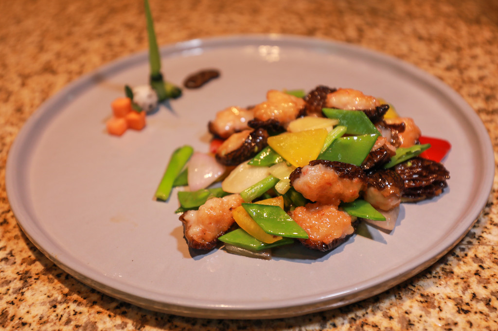 特色小炒羊肚菌,小炒羊肚菌是主厨刘杨师傅自创菜品,选材为当地羊肚菌,经过独特加工,色泽十分鲜艳精致的摆盘,让色香味俱全。