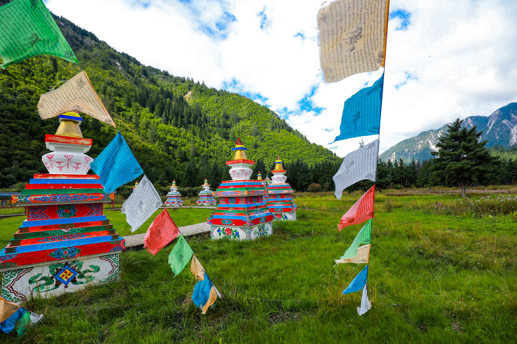 “中查”神鹰降落栖歇之地,有九寨沟后花园之称,宽阔的坡地上绿草如茵、牛羊悠闲,潺潺不息的溪流旁鲜花盛放,村庄里随处可见的白塔、转经亭都是当地人最浓郁醇厚的虔诚信仰。