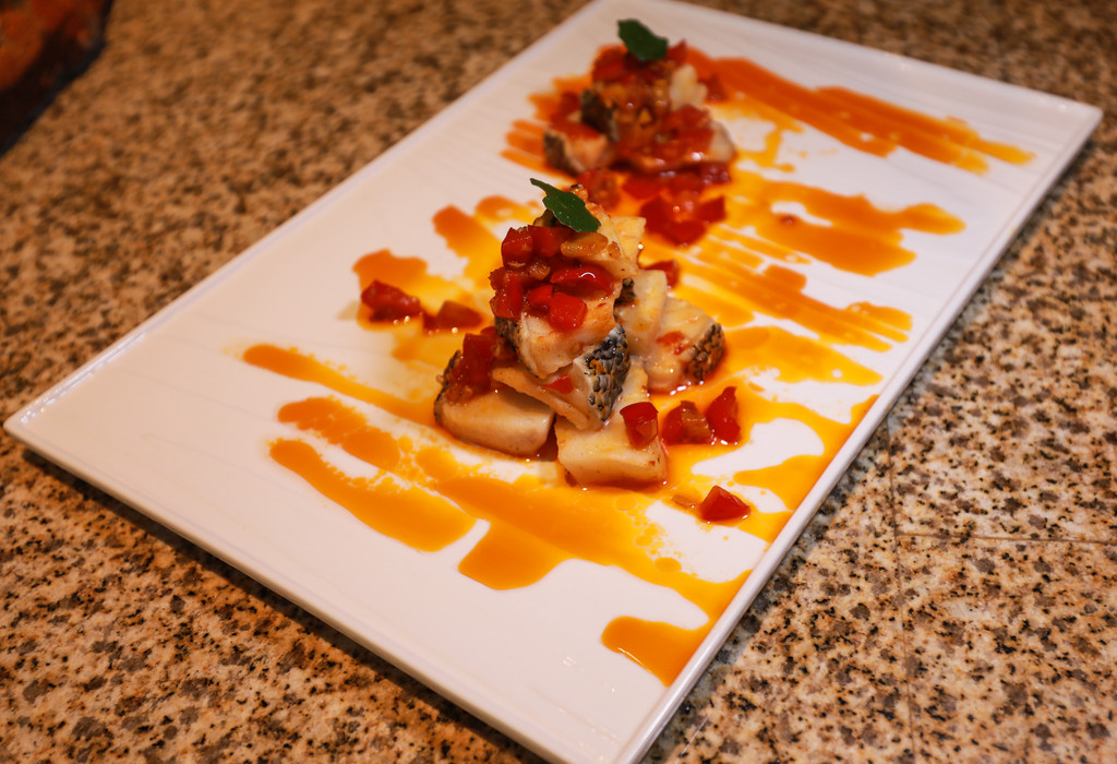 韭香原壳活鲍鱼,菜如其名,用原壳鲍鱼作为主料,使其保持了原汁原味,用煎火局的方法使鲍鱼既软嫩又鲜香,加入韭菜更增风味,光是看着就色香味俱全,咬上一个更是香气浓郁,味美可口。