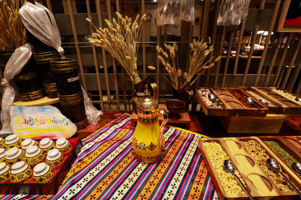 藏式美食区的酥油茶值得一试哦!酥油茶在藏族饮食中十分常见,将烧开的砖茶水和酥油在专用的酥油桶中充分搅和,待茶油融为一体后,加少许盐制成的,还糌粑和牦牛酸奶,耗牛酸奶比较浓厚,还未吃就能闻到淡淡的奶香,口感香滑,奶味十足。