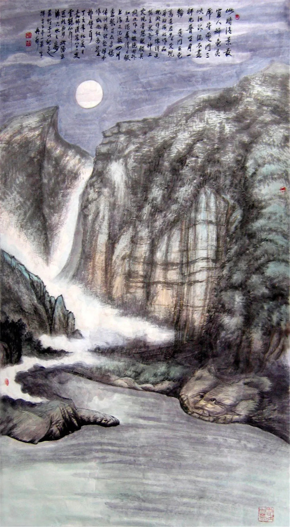 《神龟灵虎金龙锁夔门》画作为六尺长卷,具有与众不同的创意。在这“国画版”的《神龟灵虎金龙锁夔门》姐妹篇画作中,雄伟壮观的夔门,宁静淡雅的明月,栩栩如生的“神龟”,活灵活现的“灵虎”,生气勃勃的“金龙”,滔滔不绝的江水,朦胧神秘的夜景,达到了动人心魄,钩人灵魂的效果。宋先生的摄影,是一种发现;周老先生的画作是一种表现。先发现后表现,从自然到艺术,用镜头和画笔同步写出了大自然的天然真趣。借摄影作品绘画,使摄影绘画互补,找到了摄影绘画实中有幻,幻中描实的契合点,大胆泼墨,大大提升了该画作的品味!