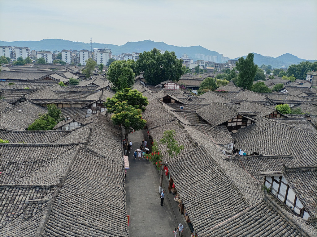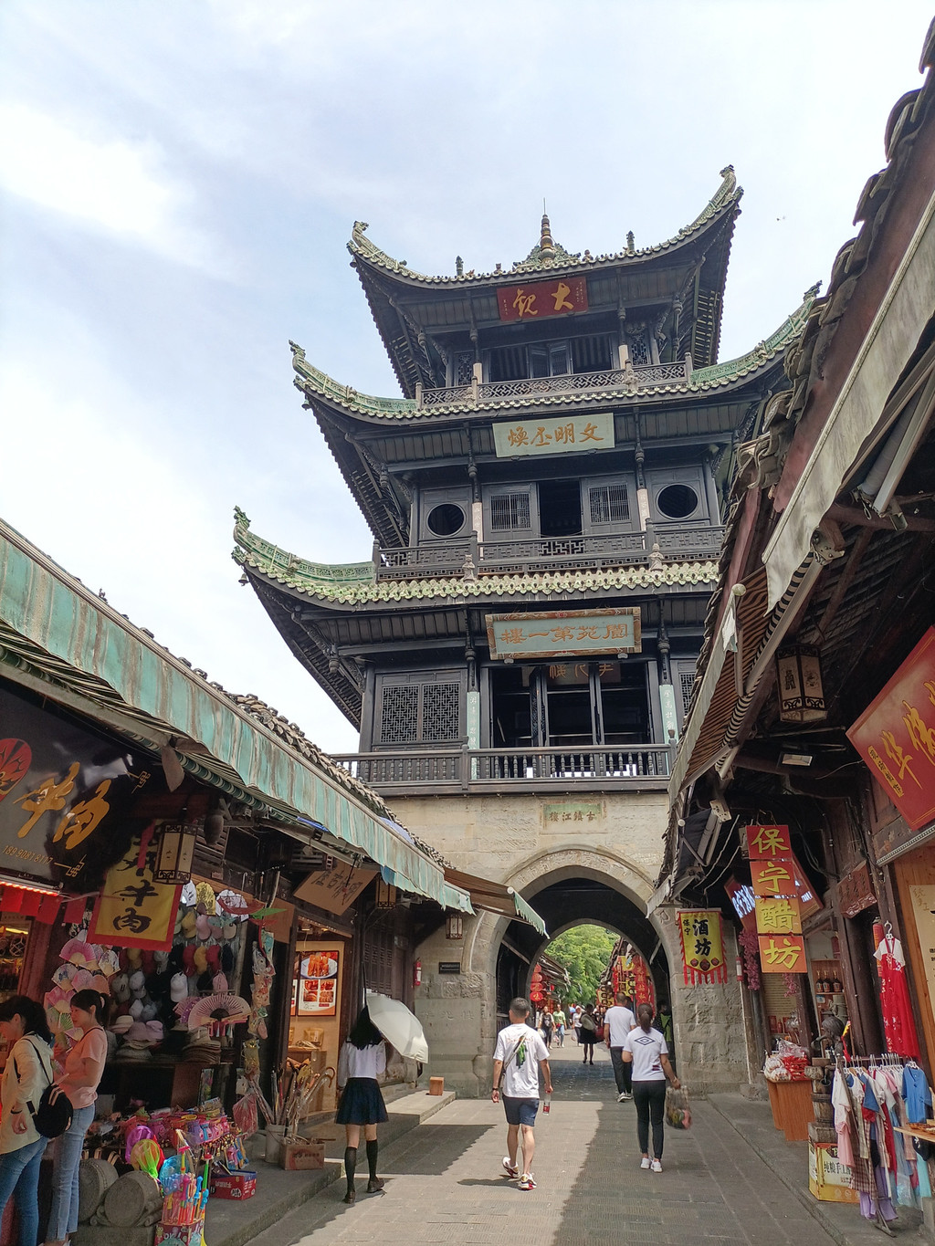 在住处附近有热闹的市场,吃到了著名的烤烧饼夹凉粉,买了些这里的腊肉,跑到邮局寄了快递到上海,免得上飞机不让带。第三天就上了去阆中的高铁,不一会就到了阆中站,寄存了行李叫了辆出租车到了阆中古城。满大街都是保宁醋的味道,走到了中街,这座就是中天楼,上楼就能俯瞰街景。