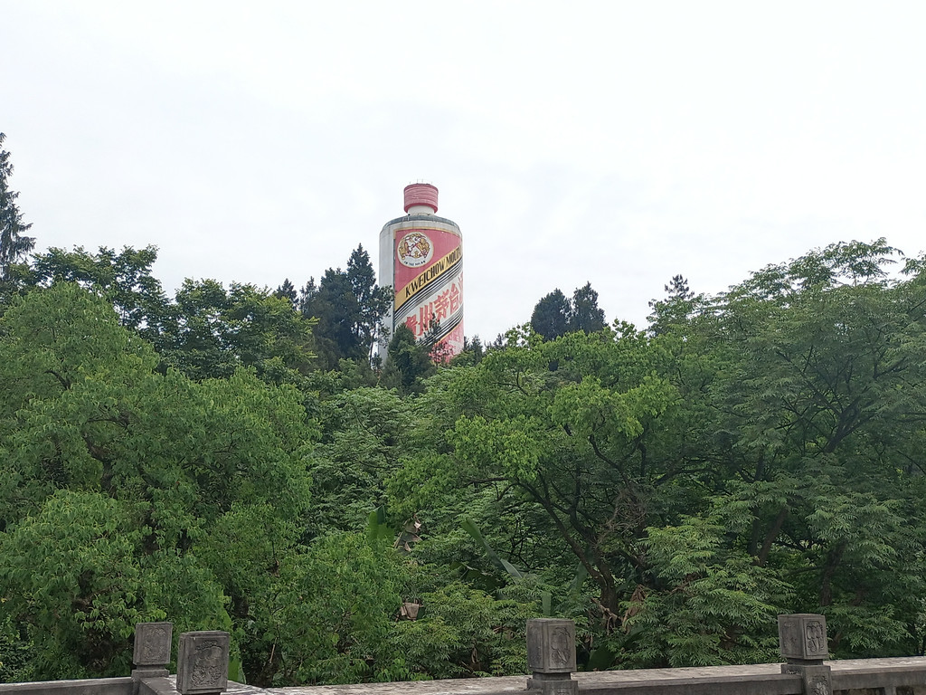 我们到了一处景点,是在仁怀市郊,山上有一个几层楼房高的茅台酒瓶,内部有电梯上去,可惜不开放,只能远观。