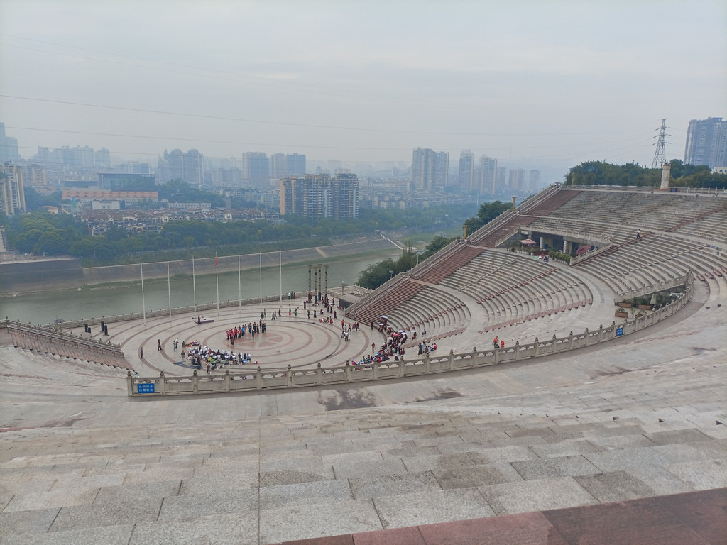 下午去了江北,下图是百子图广场。是按地形修成罗马式的剧场,背景就是沱江。人们正在排练建党100周年的文艺节目,这广场设计得真有创意。