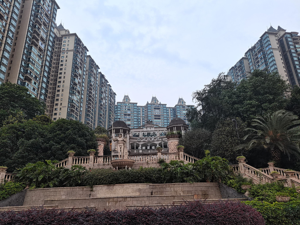 下榻酒店近旁的一个住宅小区,成片高楼拔地而起,迎面是欧式的高台阶花园。