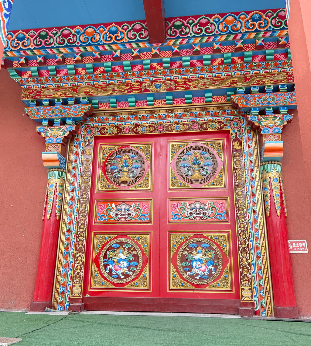 寺院规模不大,但大殿铜顶鎏金,雕梁画栋,屋檐上金幢、宝瓶、莲花直冲云霄,颇有气势。