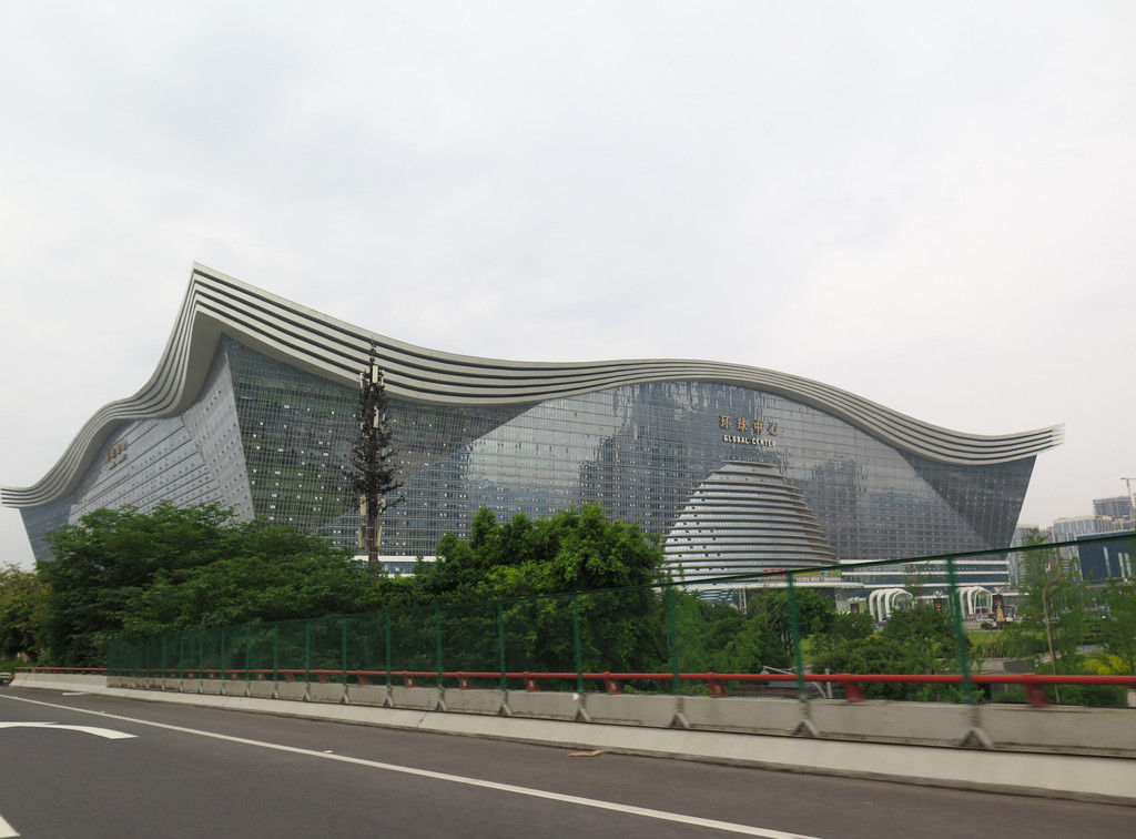 路过新世纪环球中心,位于天府大道北段,被誉为亚洲第一大单体建筑,总建筑面积约176万平方米。以“飞翔的海鸥,起伏的海浪”为造型,在阳光和水景的映衬下,形成“水上聚宝盆”样式。是集游艺、展览、商务、购物、酒店等于一体的多功能建筑。