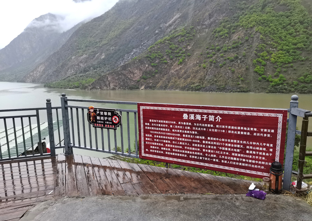 叠溪海子由两个大小不同的湖组成,分别称为上、下海子,湖面海拔2258米。附近有若干景点,当年的大地震遗址已成为一处旅游景区。