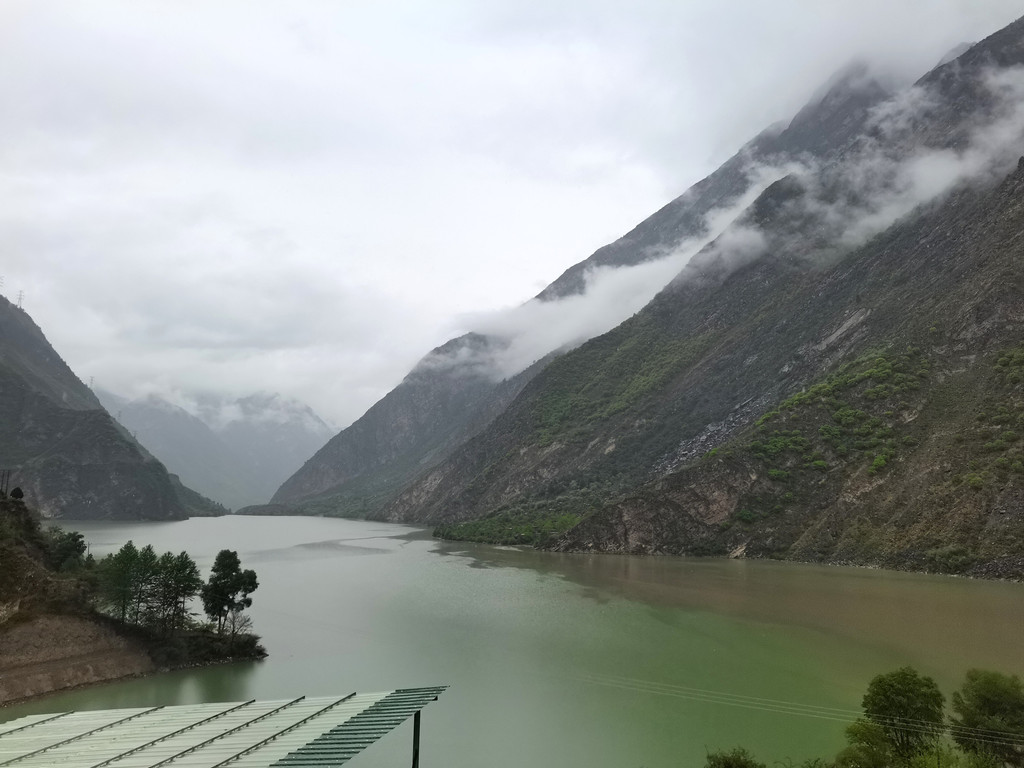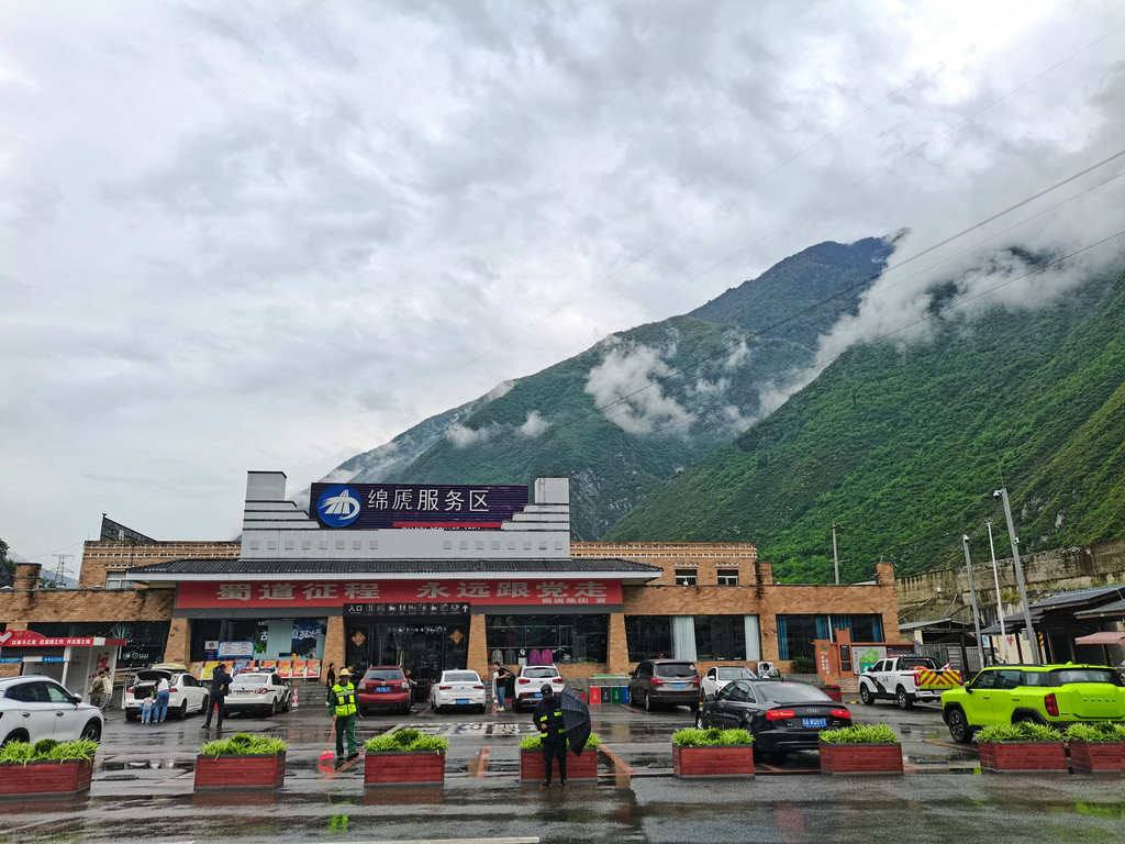 服务区紧邻岷江,河谷狭长,峰峦耸立,云雾缭绕。