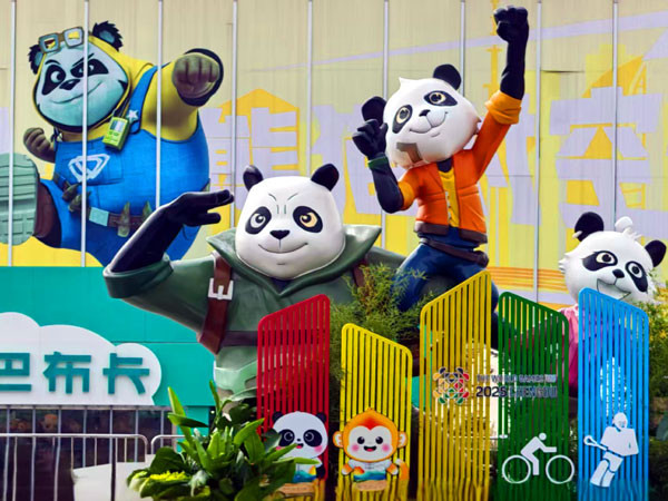 2025年9月7日8:30,《圣境巴蜀》团队,在导游王吉召与地陪导游彭得灏带领下来到成都大熊猫繁育研究基地一观。这里是世界著名的大熊猫迁地保护基地、科研繁育基地、科普教育基地和文化旅游基地。大家还没进入景区,就见外面众多的熊猫卡通造型景观很是醒目。
