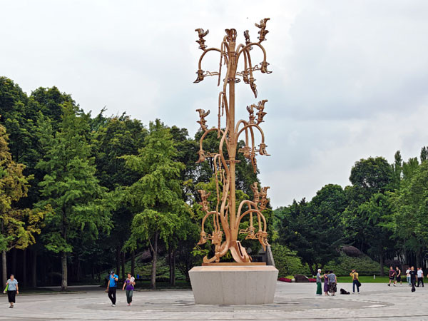 特别是展馆的青铜神树更是令人震撼,树干笔直向上,枝丫分层延伸,上面缀着太阳形饰、飞鸟和龙形附件,仿佛一棵连接天地的“神树”,让人瞬间联想到古蜀人对宇宙的浪漫想象。难怪在庭院中有其造型,可见这个“神树”文物的珍贵。