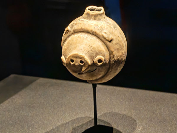 隔着玻璃,我盯着它看了许久——很难想象,三千年前的古蜀工匠,是如何用青铜铸造出这样充满想象力的造型,这双“纵目”,究竟是在眺望远方的神山,还是在凝视世间的众生?参观中意外地发现一个类似于“小猪佩奇”造型的物件。真没想到数千年古人的创意居然跟当下的差不多,太令人惊叹不已了。