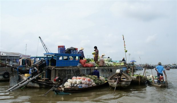 芹苴的水上市场( Floating Market,)。在河上的超市,买卖双方都划着船,卖家把自己要卖的东西挂在船头上,一目了然,有批发,有零售,还有的小船卖午餐和饮料。我们第一次看到如此大型的水上市场,很有新鲜感。我们的船靠在一个卖菠萝的大船旁边,一个削好的大菠萝卖半个美元,很便宜,比国内见到的大而且漂亮,我们当然不会放过,立即来一个,果真美味。