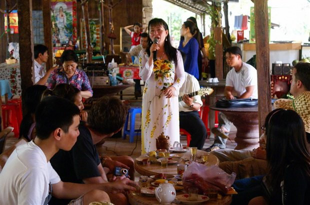 湄公河水网间,两边果树果实累累,好一派江南水乡之景色.我们参观了如何做椰子糖,观看了本地的小节目,独唱小合唱,只可惜听不懂,但我们可以好好品尝各种各样的免费水果喔,很丰富。