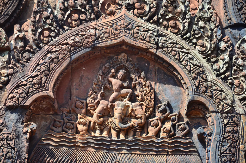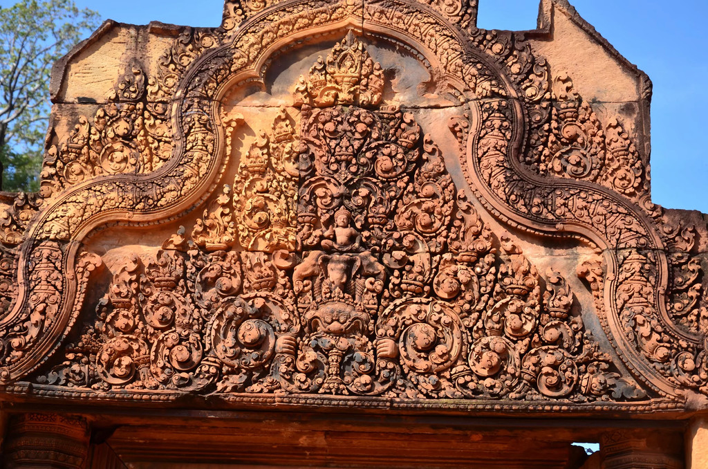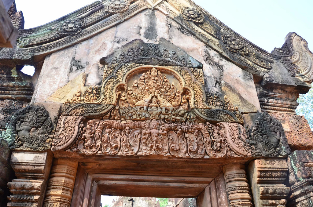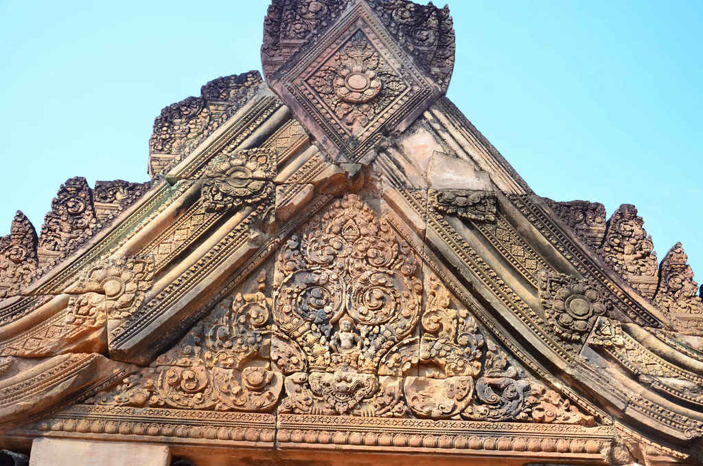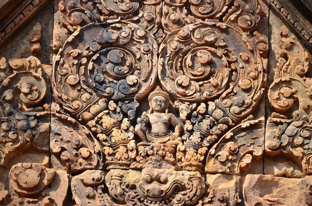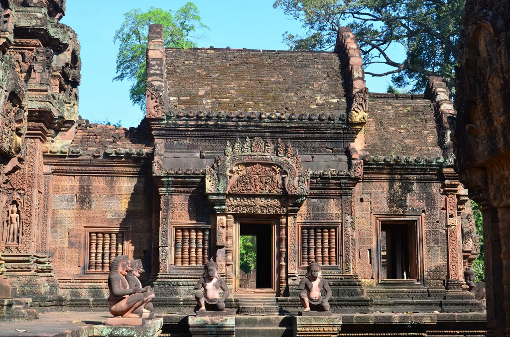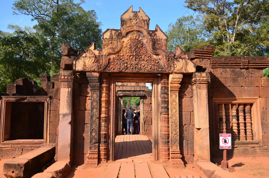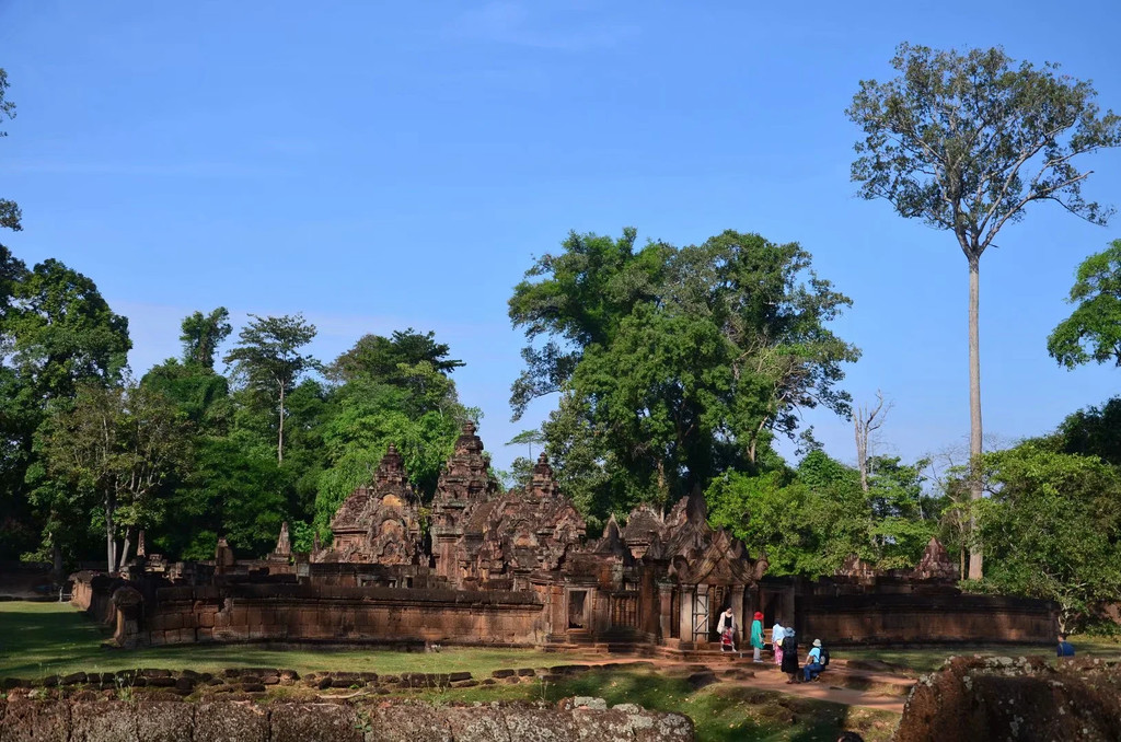 女王宫又翻译为“班蒂丝蕾”,法国人称它为吴哥的珍珠。整个建筑由玫瑰色的砂岩建成,尺度不大,小巧玲珑,精雕细刻,三座寺塔并列,游客不能进去,站在旁边稍高的地方望去,就像是一个精致的沙盘。早上的光线很好,可惜我们自己拍不好。