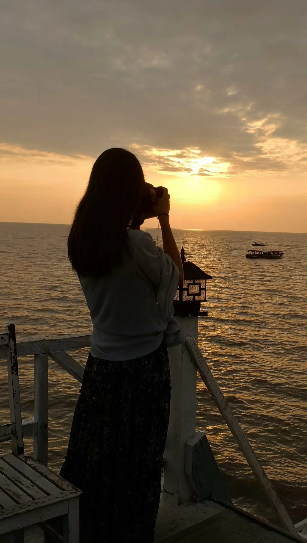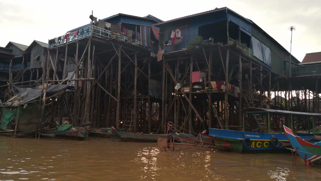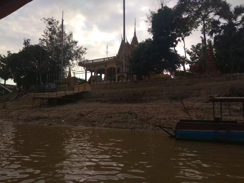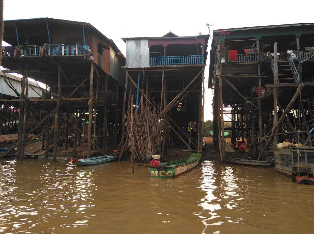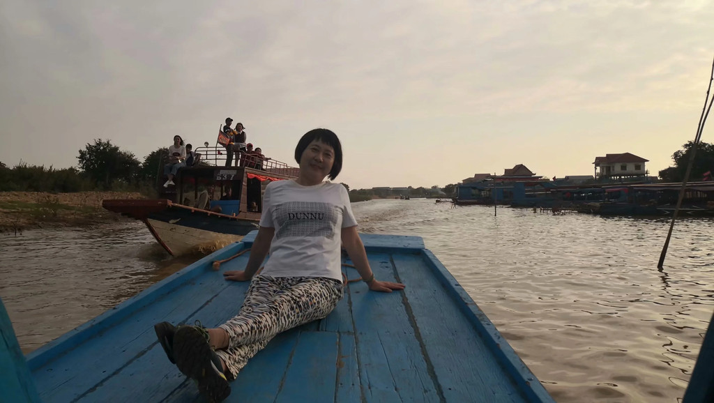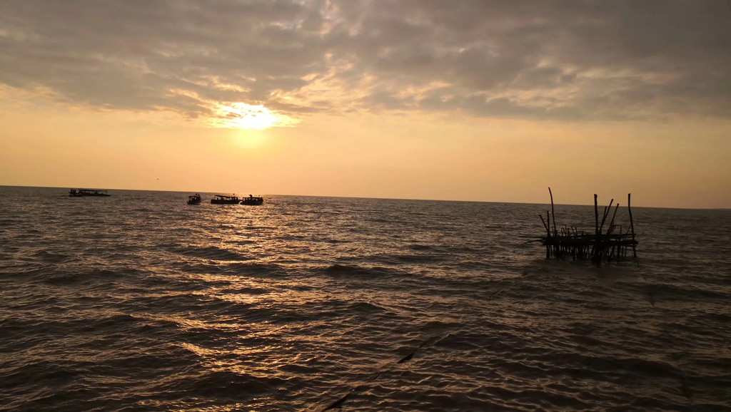 至此,暹粒的寺庙我们是游览完了,我们要去浮村和洞里萨湖看日落了,去这里,每人还要另付20刀。游客去浮村一般有三个选择,我们去的是空邦鲁浮村。一路上,云层渐渐加厚,我们都不禁担心能否看得到落日,但我们并不想放弃,看不到落日,看看浮村、看看洞里萨湖也好。随着离目的地越来越近,云层渐渐散去。到了一个很简陋的卡口,阿东下车帮我们去买票,然后车子就开上了一条土路,路的两旁没有房屋、也没有高大的树木——我们已经进到了洞里萨湖,现在是旱季,湖水退去,车子就在湖底开着,尘土飞扬,似乎就在浓烟中穿行,后来想想这样很不安全,好在车子极少。车子走了一段,看到几间空空的简易的板房,阿东说往年这个季节就是在这里上船,但今年比较旱,湖水到不了这个地方,车子继续往前开,终于看到了简陋的码头,阿东去验票,然后带我们上了一条船——船上没有别的游客,这是一条有着巨大轰鸣声的柴油机动船,沿着不宽的河道开出,湖水浑浊,空气中弥漫着浓浓的腥味,渐渐地两边出现了越来越多的高脚板房,聚集在一起杂乱无章,到底有多少人、多少户,问阿东,他也说不准,反正这里有学校、邮局、寺庙,阿东还指着寺庙旁的一个建筑说这是火葬场。但同时我们心里也在疑惑,难道这就是东南亚第一大淡水湖、柬埔寨的母亲湖。随着船转过一片红树林,突然豁然开朗,一望无际的湖水就这样毫无征兆地展现在眼前,湖水也变得清澈,腥味也没有了,太阳悬在远远的天边。