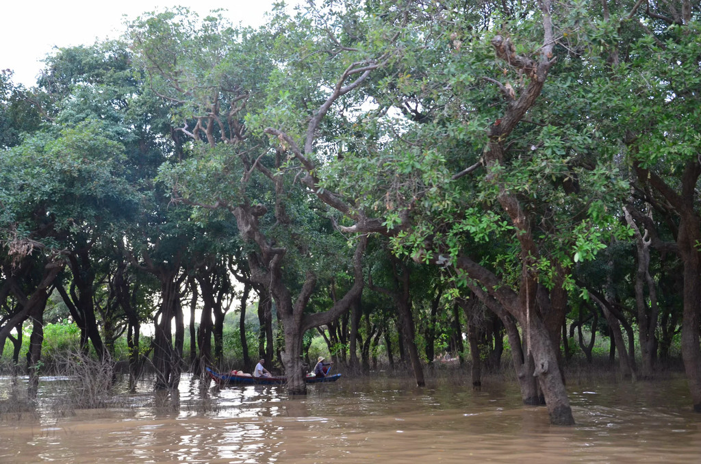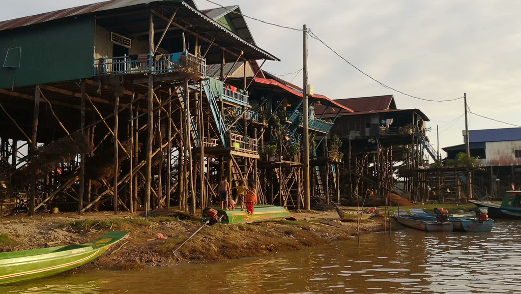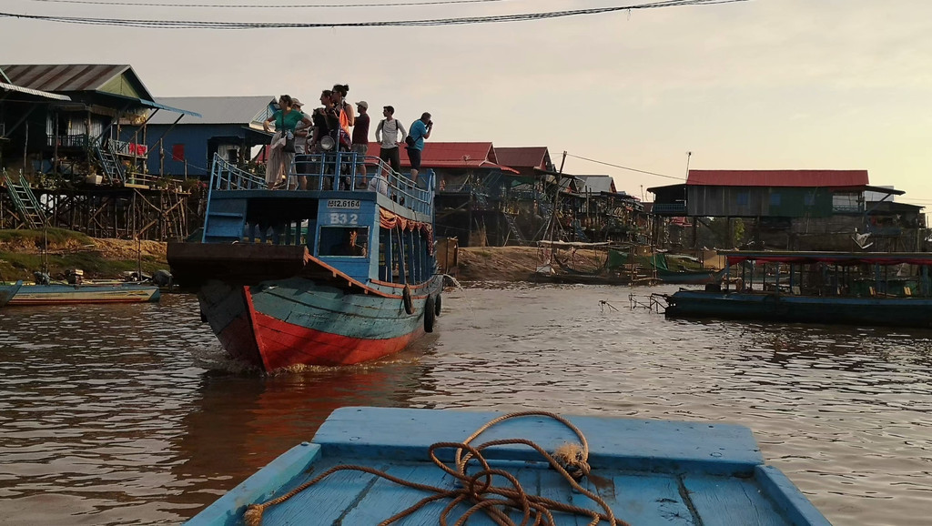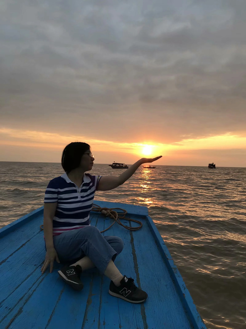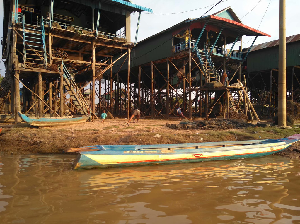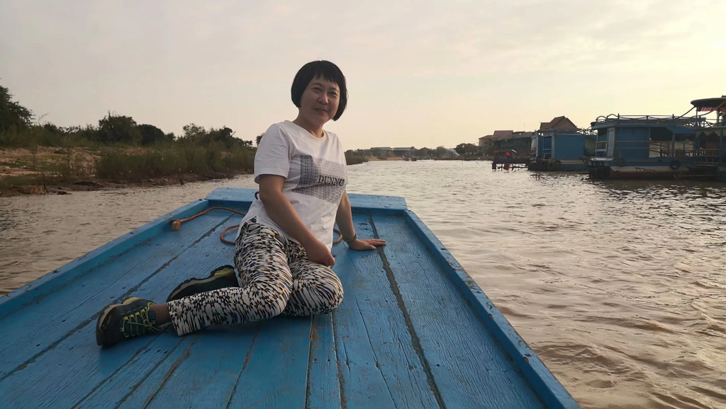 至此,暹粒的寺庙我们是游览完了,我们要去浮村和洞里萨湖看日落了,去这里,每人还要另付20刀。游客去浮村一般有三个选择,我们去的是空邦鲁浮村。一路上,云层渐渐加厚,我们都不禁担心能否看得到落日,但我们并不想放弃,看不到落日,看看浮村、看看洞里萨湖也好。随着离目的地越来越近,云层渐渐散去。到了一个很简陋的卡口,阿东下车帮我们去买票,然后车子就开上了一条土路,路的两旁没有房屋、也没有高大的树木——我们已经进到了洞里萨湖,现在是旱季,湖水退去,车子就在湖底开着,尘土飞扬,似乎就在浓烟中穿行,后来想想这样很不安全,好在车子极少。车子走了一段,看到几间空空的简易的板房,阿东说往年这个季节就是在这里上船,但今年比较旱,湖水到不了这个地方,车子继续往前开,终于看到了简陋的码头,阿东去验票,然后带我们上了一条船——船上没有别的游客,这是一条有着巨大轰鸣声的柴油机动船,沿着不宽的河道开出,湖水浑浊,空气中弥漫着浓浓的腥味,渐渐地两边出现了越来越多的高脚板房,聚集在一起杂乱无章,到底有多少人、多少户,问阿东,他也说不准,反正这里有学校、邮局、寺庙,阿东还指着寺庙旁的一个建筑说这是火葬场。但同时我们心里也在疑惑,难道这就是东南亚第一大淡水湖、柬埔寨的母亲湖。随着船转过一片红树林,突然豁然开朗,一望无际的湖水就这样毫无征兆地展现在眼前,湖水也变得清澈,腥味也没有了,太阳悬在远远的天边。