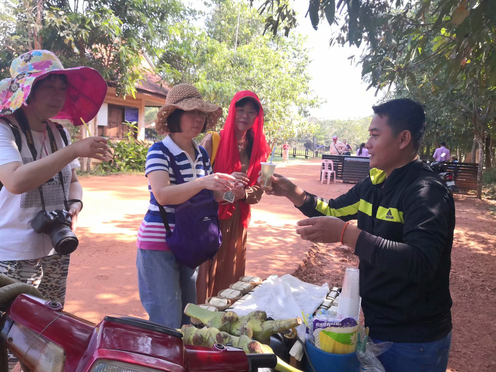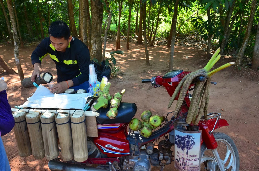从女王宫出来,在景区门口有小贩在卖棕糖果汁——棕糖树的树干呈一节一节的葫芦形,这几天看到的寺庙的窗棂和门的立柱都是这种造型,果实雌雄异体,里面都有很甜的汁,我们每人要了一杯,其中我要的一杯冰的,也就是加了冰块。其实在网上看过别人的游记,提醒不要加冰块,因为制冰的水很可能不卫生。果然,悲剧了。