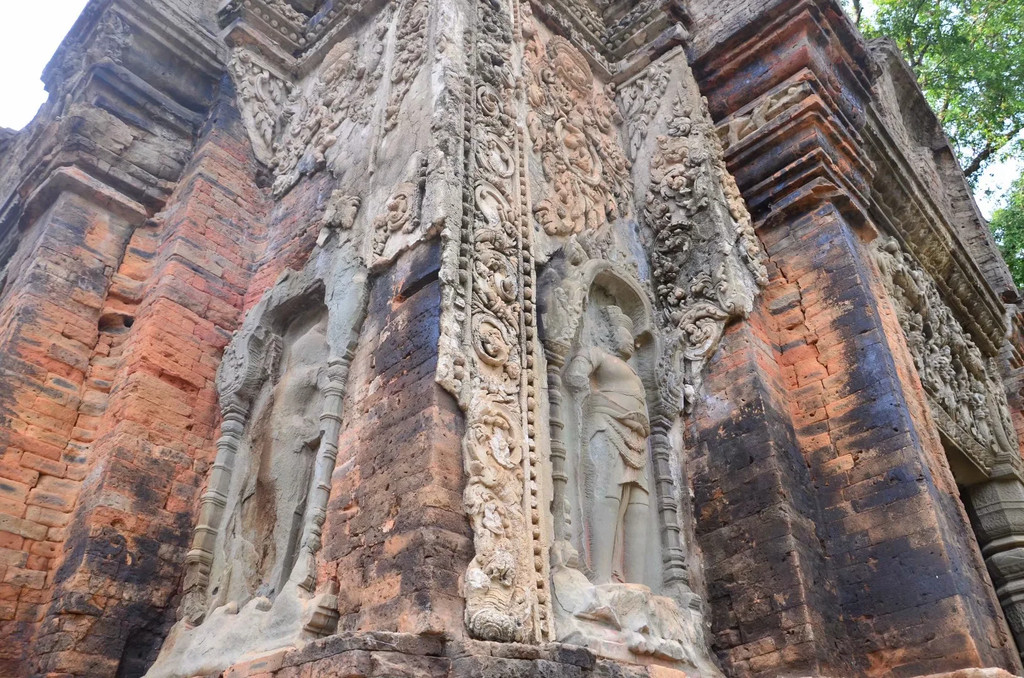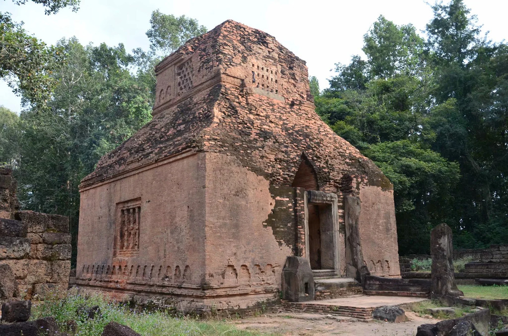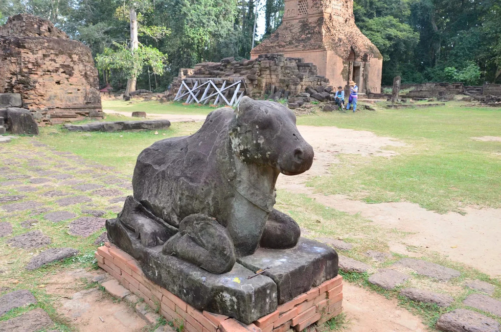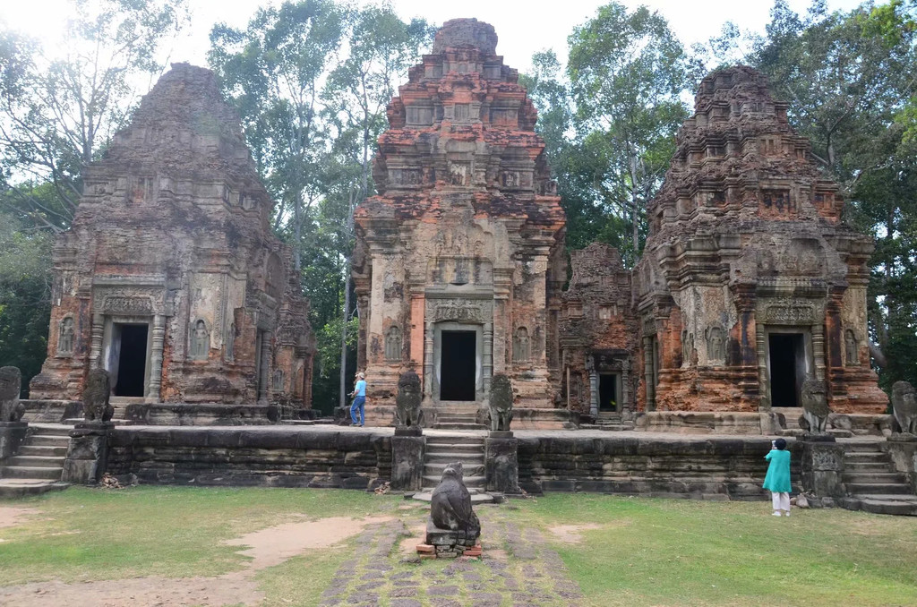 午饭以后,去罗洛斯遗址,这是前吴哥时代都城所在地,现在还存有三座寺庙的遗迹。三座寺庙是:普利科寺(又叫神牛寺),这是为纪念祖先的宗庙,有六座砖塔,前面三座是纪念父系祖先,后面三座是纪念母系祖先;巴孔寺(又叫巴空寺),这是一座山神殿,是有五层台阶的须弥山式建筑,在东门入口处有一座现代寺院;洛雷寺(又叫罗莱寺),这是一座被遗弃的水神庙,现在正在维修,阿东给我们看了手机里的照片,外面搭满了脚手架,我们也就没过去了。