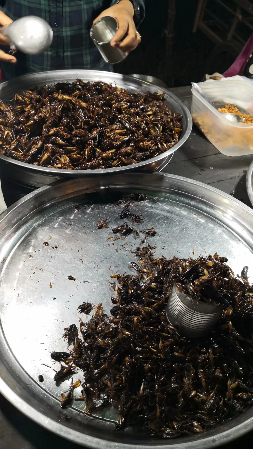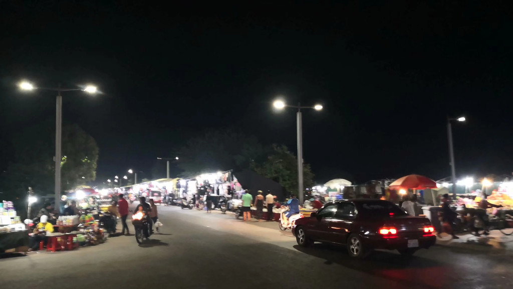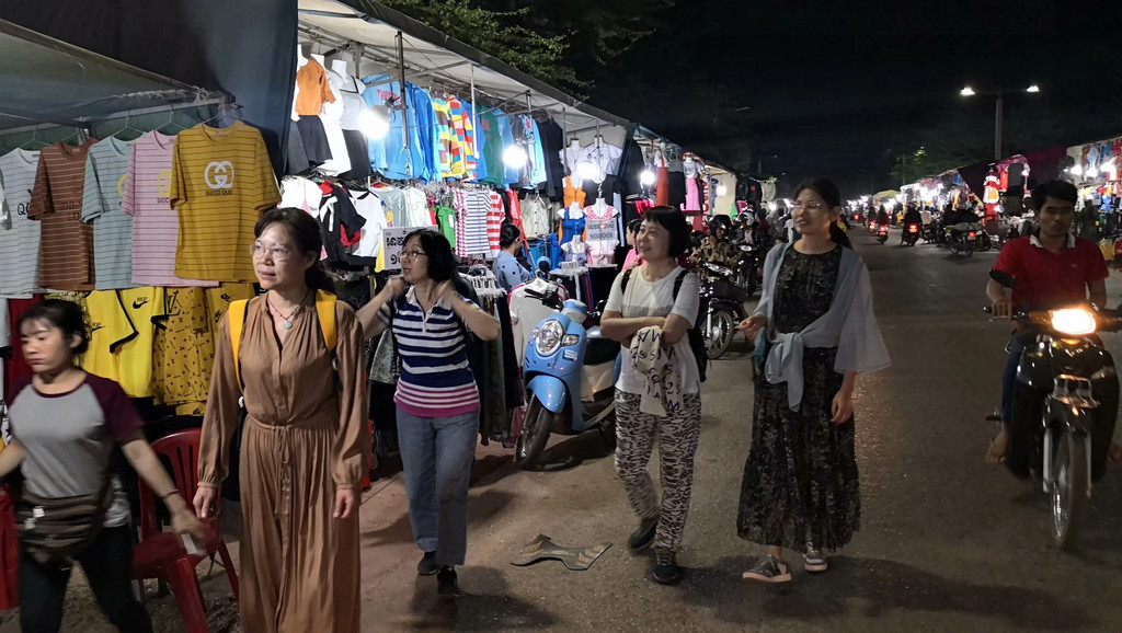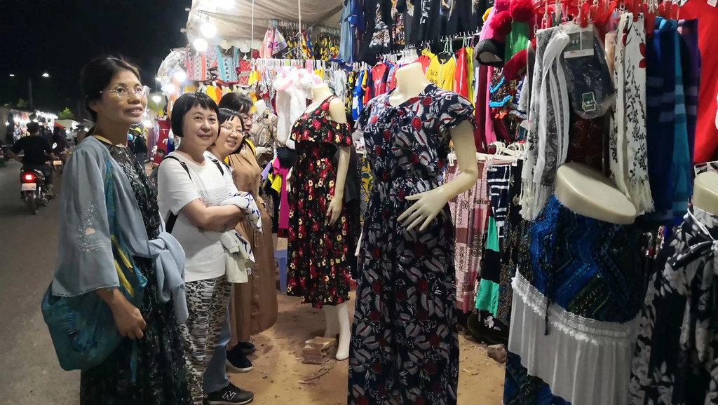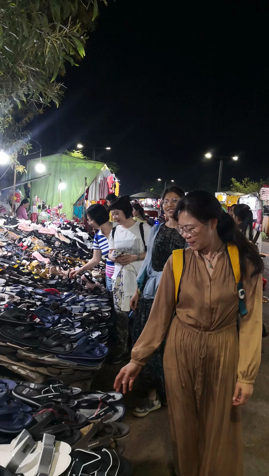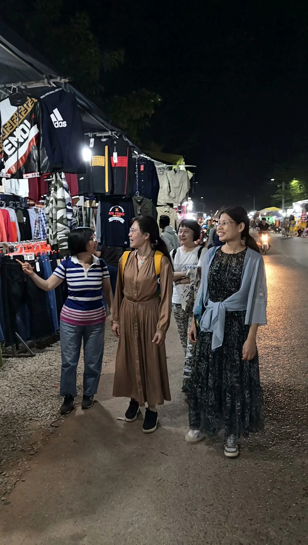 坐车回来的路上,阿东说刚才他给了开船的5刀小费,这个我们似乎并没有在别人的攻略中看到过,但我们还是把这5刀小费给了阿东。然后阿东又问我们想不想去吃火锅、吃烧烤、吃当地人吃的美食,说实在的,我们几个对火锅、烧烤之类的没什么兴趣,但看到他热情地推荐,就同意去吃当地人吃的美食,虽然对卫生条件心存疑虑。夜市,在售票处前的公路两旁,有卖衣服鞋包的,还有小吃摊,甚至还有小孩子玩的充气城堡之类的娱乐设施(很简陋的那种),有游客坐突突车过来逛逛,更多的是本地人在消费。阿东言辞中似乎有一点点自豪,在他看来这里的物品是相当丰富了,但是在我们眼里就像是30年前的农村大集。最要命的是,绵延这么长的夜市竟然没有一个厕所,售票处的厕所晚上也关了。阿东带我们去他朋友开的烧烤摊上吃东西,但他朋友今天晚上没有出摊,他略微有点失望。看我们对在这里吃东西也不是很感兴趣,就送我们回酒店了。