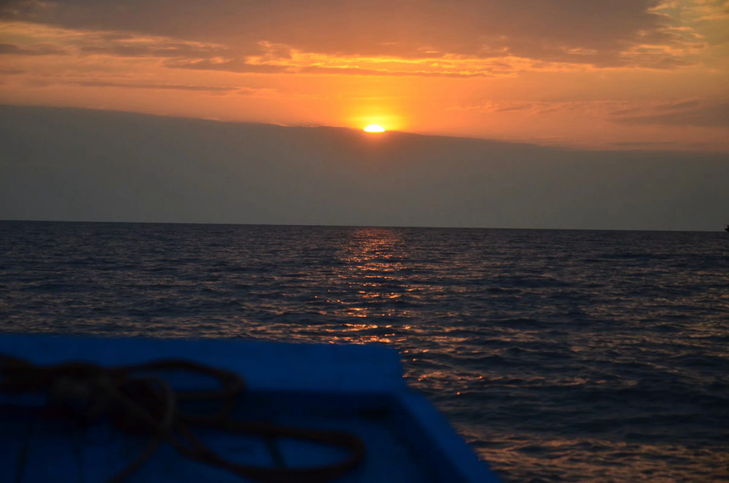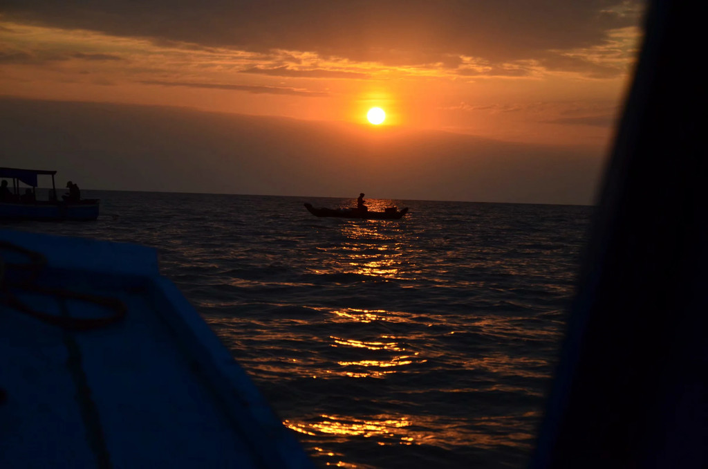 船继续向湖中开去,到了一个水上平台,阿东带我们上了平台,让我们吃点东西、休息一下,我们上下转了一圈,没啥意思,急着想坐船往湖中心去,但阿东似乎并不着急,给我们拍照,还让我们去看水池中的鳄鱼。后来我们终于明白过来,是要我们在这里消费,赶紧去买了5个椰子(2刀/个,比在陆地上要贵)。匆匆喝完椰汁,坐船去湖的更深处。落日把湖面染成红色,我再一次感到语言的贫乏,除了美、壮观,想不出别的词。时间很短,落日很快就沉下去了,我们坐船原路返回,只是没有再上平台。