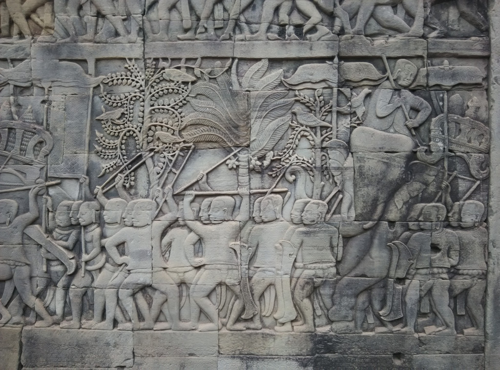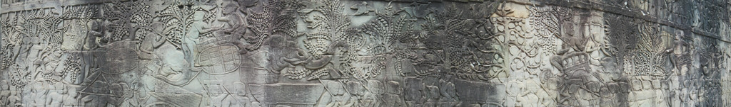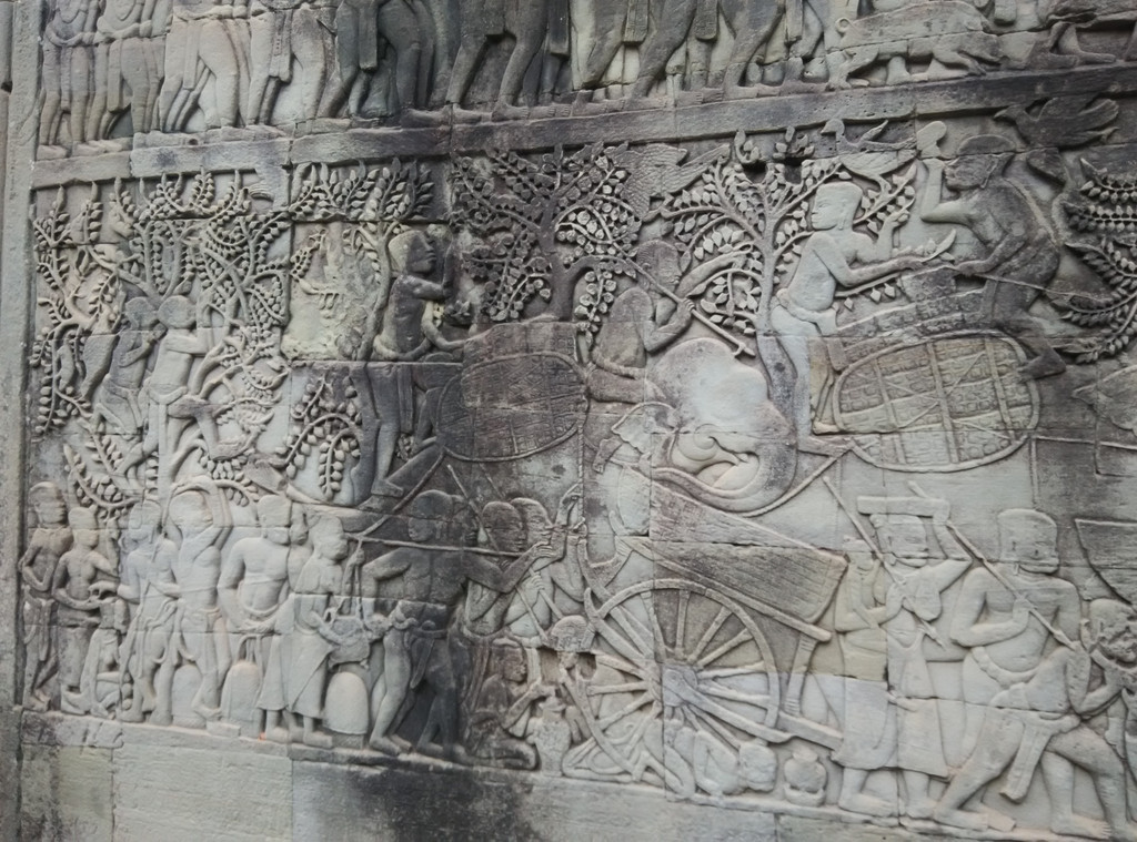 除了四面佛,巴戎寺的回廊浮雕也不容错过。巴戎寺底层浮雕从东门开始顺时针行进,看到的分别是:出征占婆—林迦崇拜—水战—水上生活—赢得胜利—斗鸡和下棋—军队—内战—大鱼吞羊—胜利游行—马戏团—占婆人洗劫吴哥,那一幅幅活灵活现的浮雕彷佛诉说着一段段遥远的故事。这些丰富且生动的雕刻,举凡古代战争记述、寻常百姓之生活百态、洞里萨湖之湖畔风光等皆充分展示了吴哥王朝当时的情景,绝对是不可不看的珍贵史迹。