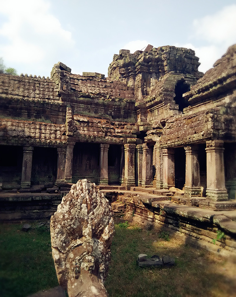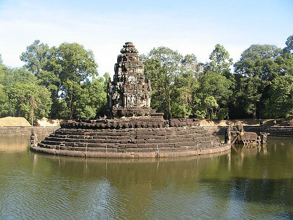龙蟠水池(Neak Pean),位于圣剑寺以东300米,所以司机很顺手地把第二站放在了这里。水池名字原意为缠绕的巨蛇,缘于水池中小岛上依照须弥山而建造的石塔上,有一个两条那迦缠绕在一起的雕像。