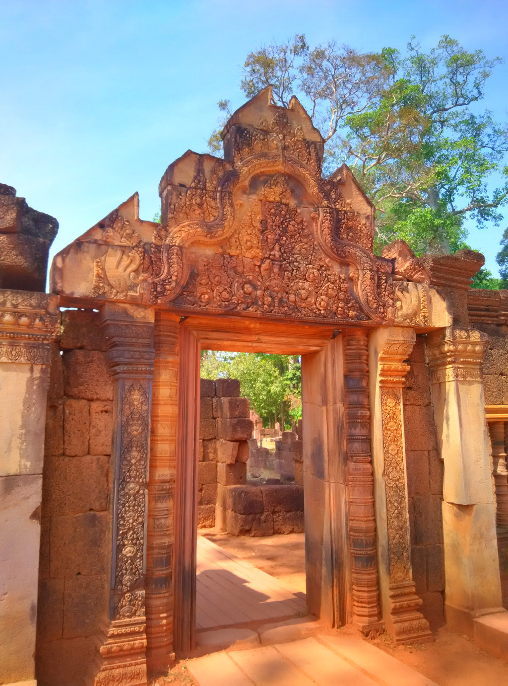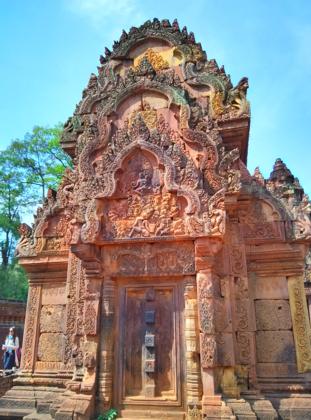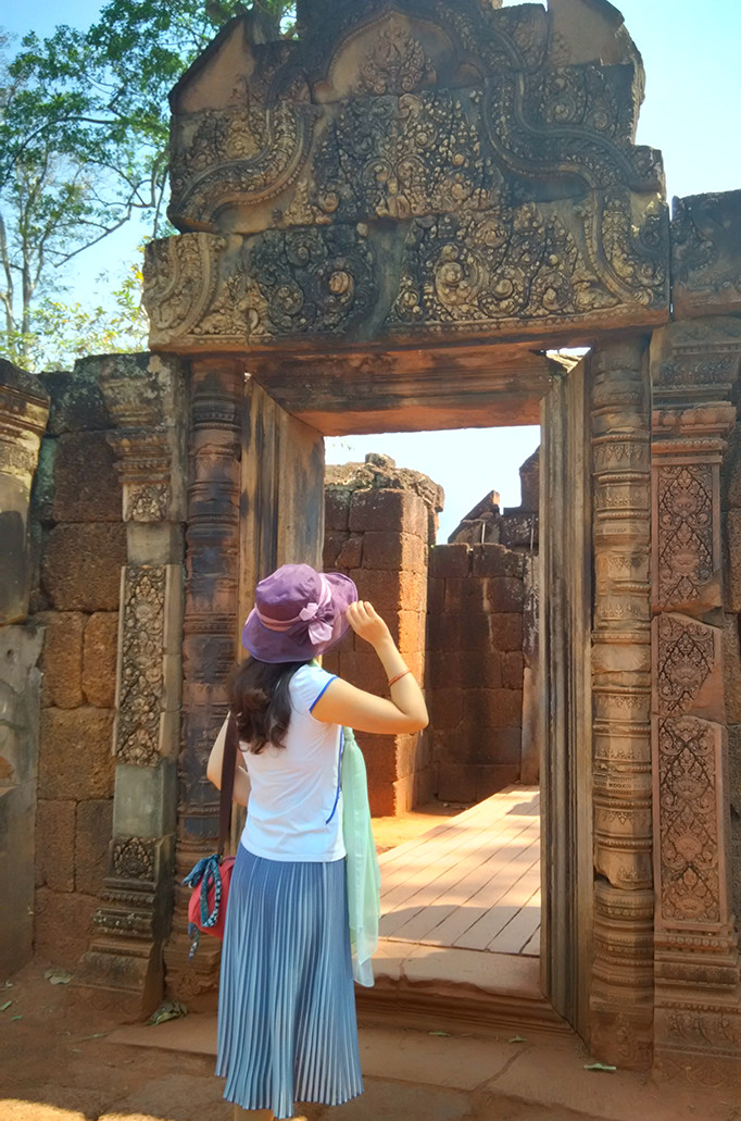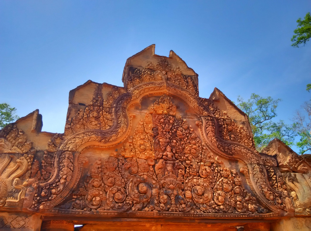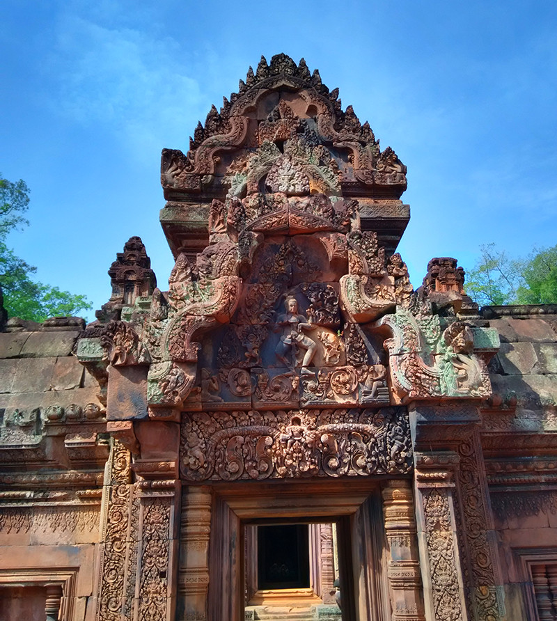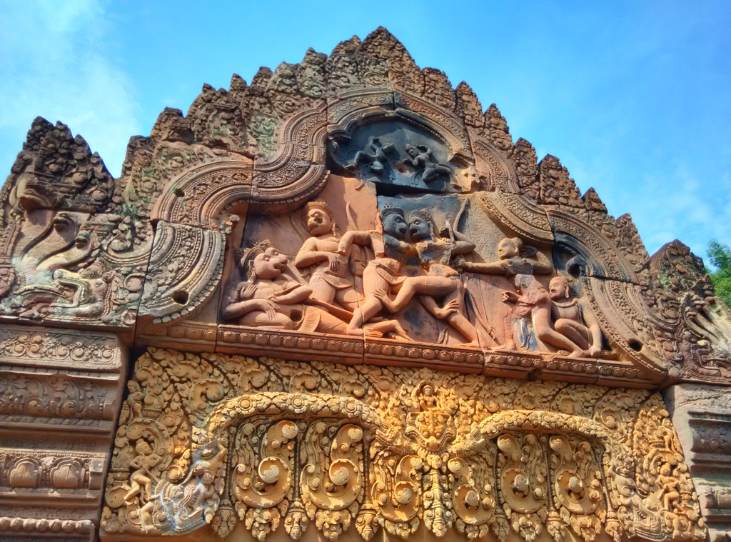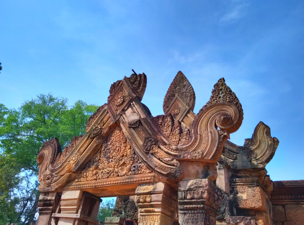 女王宫的浮雕刀工流畅细腻,造型繁复圆润,线条纤巧柔美,色彩鲜艳妩媚,在所有吴哥浮雕中首屈一指,被誉为“吴哥艺术之钻”。徜徉在女王宫精美绝伦的浮雕中,仿佛穿行在一座艺术博物馆内,纵深百米的庙宇,每根石柱、每个门楣,都非常精细地雕刻着,或神、或魔、或兽、或人,无一遗漏,那些生动的画面让我们甘心沉浸在那些古远的场景中。虽然我们并不能读懂每一幅雕刻背后的故事,但是我们的内心依然会为这些艺术所深深感动。吴哥工匠竟能将坚硬的石块,雕刻得精致剔透、高贵典雅,像一件件经过精雕细琢的首饰,哪怕再小的细节也被雕饰得一丝不苟、巧夺天工,给人一种超梦幻的感觉。