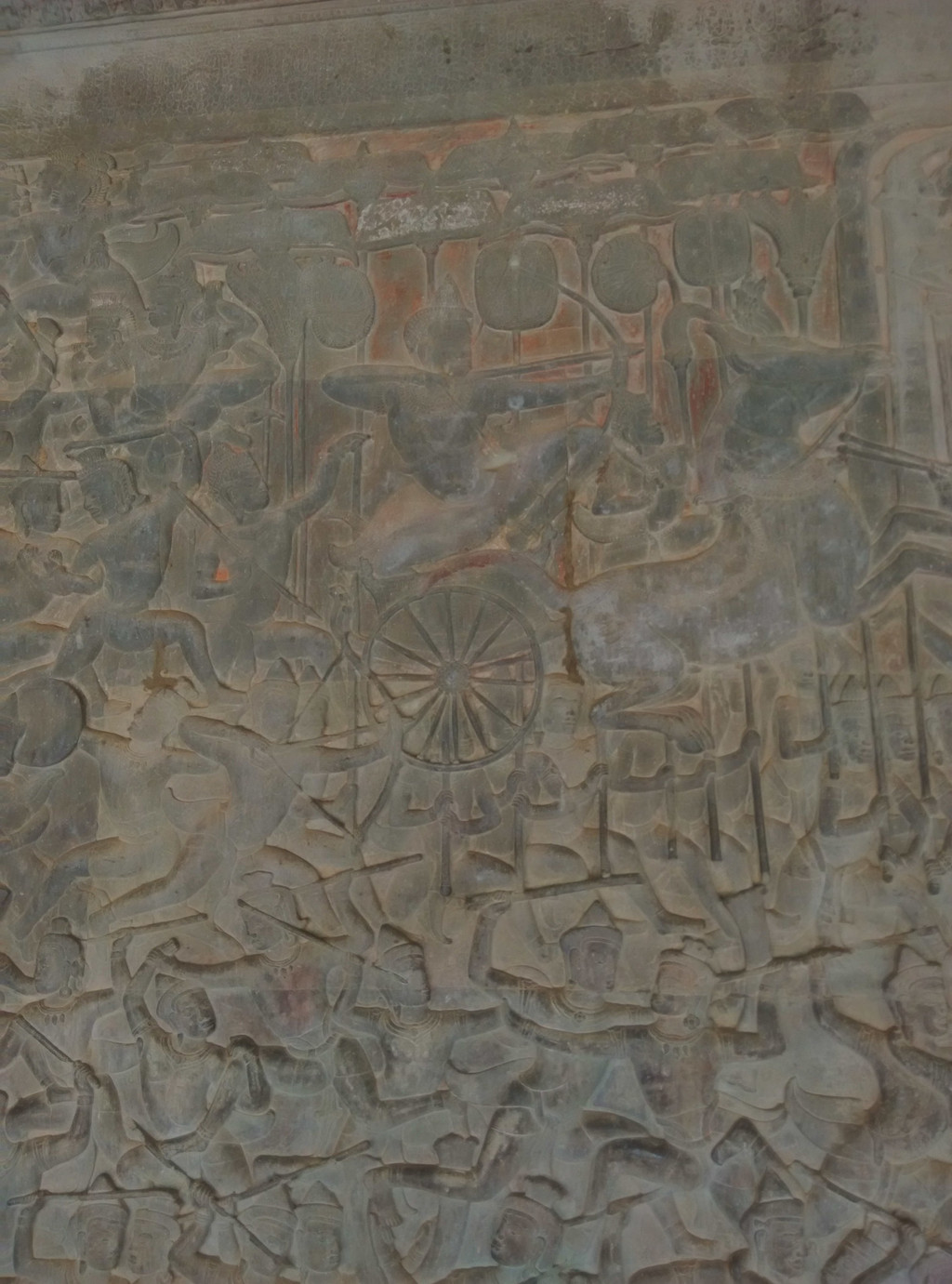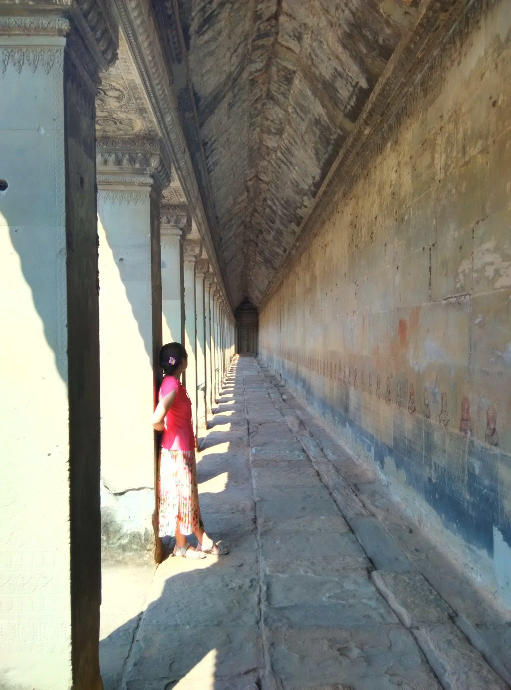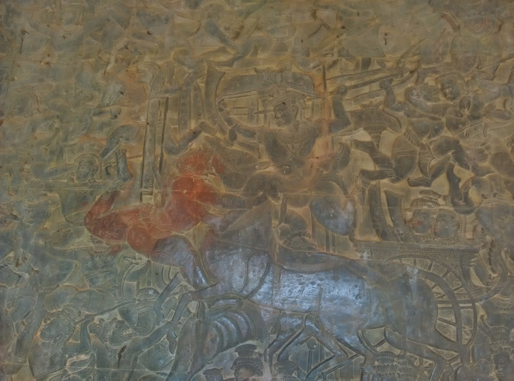 那一个蓝天白云的午后,我就这样在无穷无尽的长廊间兜兜转转,四周是光线明灭闪烁的窗棂,铺天盖地的石刻,仙女、精灵、魔怪、国王、平民就在面前一一闪现:飞舞、搅动、祭祀、行军、打仗。。。我有一瞬间的恍惚,仿佛灵魂已穿越到浮雕中的场景:从乳海中诞生的飞天女神们正在翩翩起舞,她们上身赤裸,腰肢纤细,仿佛在阐述水的涟漪荡漾,指尖就像花瓣一样一片片绽放,仿佛在用纤细柔软的手指诉说着一朵朵花儿从含苞到绽放、再到枯萎的演变;一排排手持叉戟的士兵紧紧护卫着御驾马车,坐在马车上的国王一声令下,军队就浩浩荡荡地行进开拔,轰隆隆的脚步声、车行马踏声、兵器碰撞声,排山倒海似地碾压过来,在茂密的雨林间穿行。。。