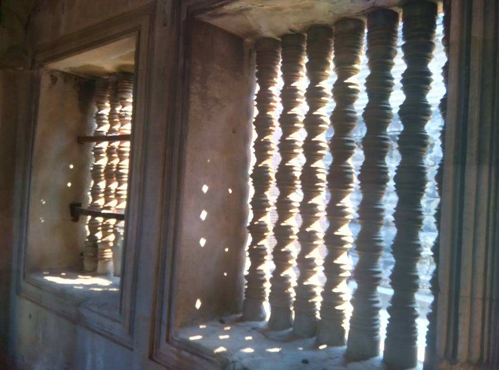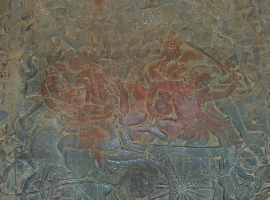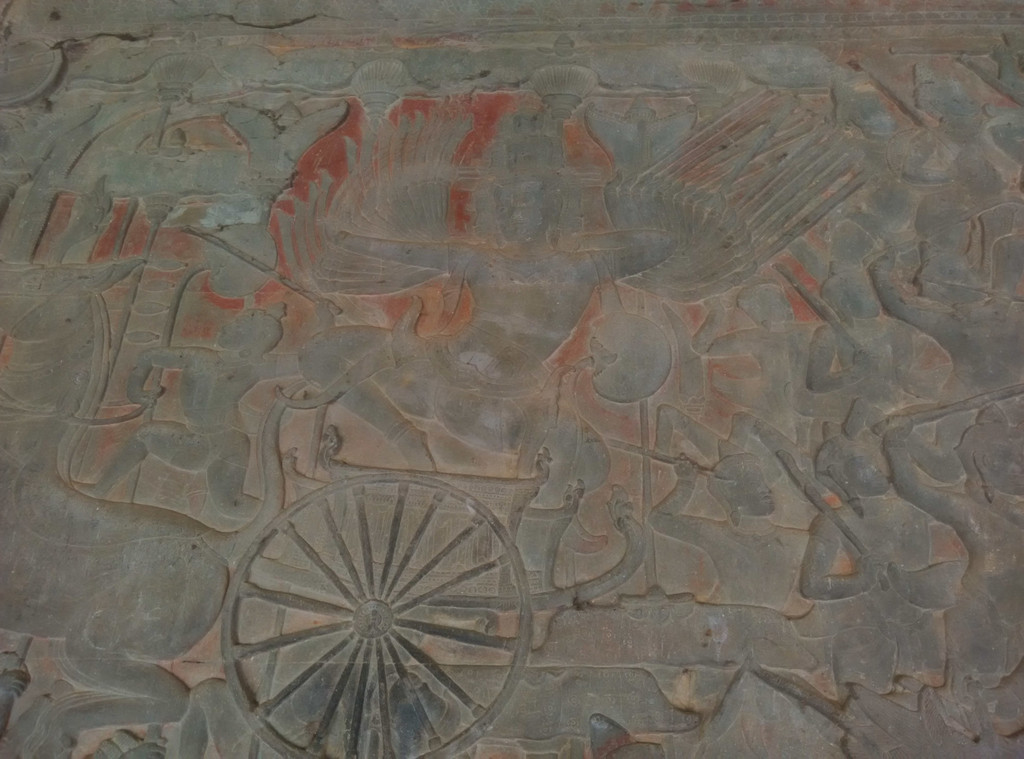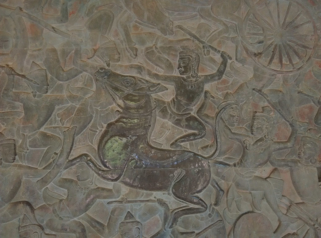 那一个蓝天白云的午后,我就这样在无穷无尽的长廊间兜兜转转,四周是光线明灭闪烁的窗棂,铺天盖地的石刻,仙女、精灵、魔怪、国王、平民就在面前一一闪现:飞舞、搅动、祭祀、行军、打仗。。。我有一瞬间的恍惚,仿佛灵魂已穿越到浮雕中的场景:从乳海中诞生的飞天女神们正在翩翩起舞,她们上身赤裸,腰肢纤细,仿佛在阐述水的涟漪荡漾,指尖就像花瓣一样一片片绽放,仿佛在用纤细柔软的手指诉说着一朵朵花儿从含苞到绽放、再到枯萎的演变;一排排手持叉戟的士兵紧紧护卫着御驾马车,坐在马车上的国王一声令下,军队就浩浩荡荡地行进开拔,轰隆隆的脚步声、车行马踏声、兵器碰撞声,排山倒海似地碾压过来,在茂密的雨林间穿行。。。