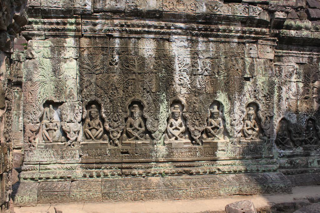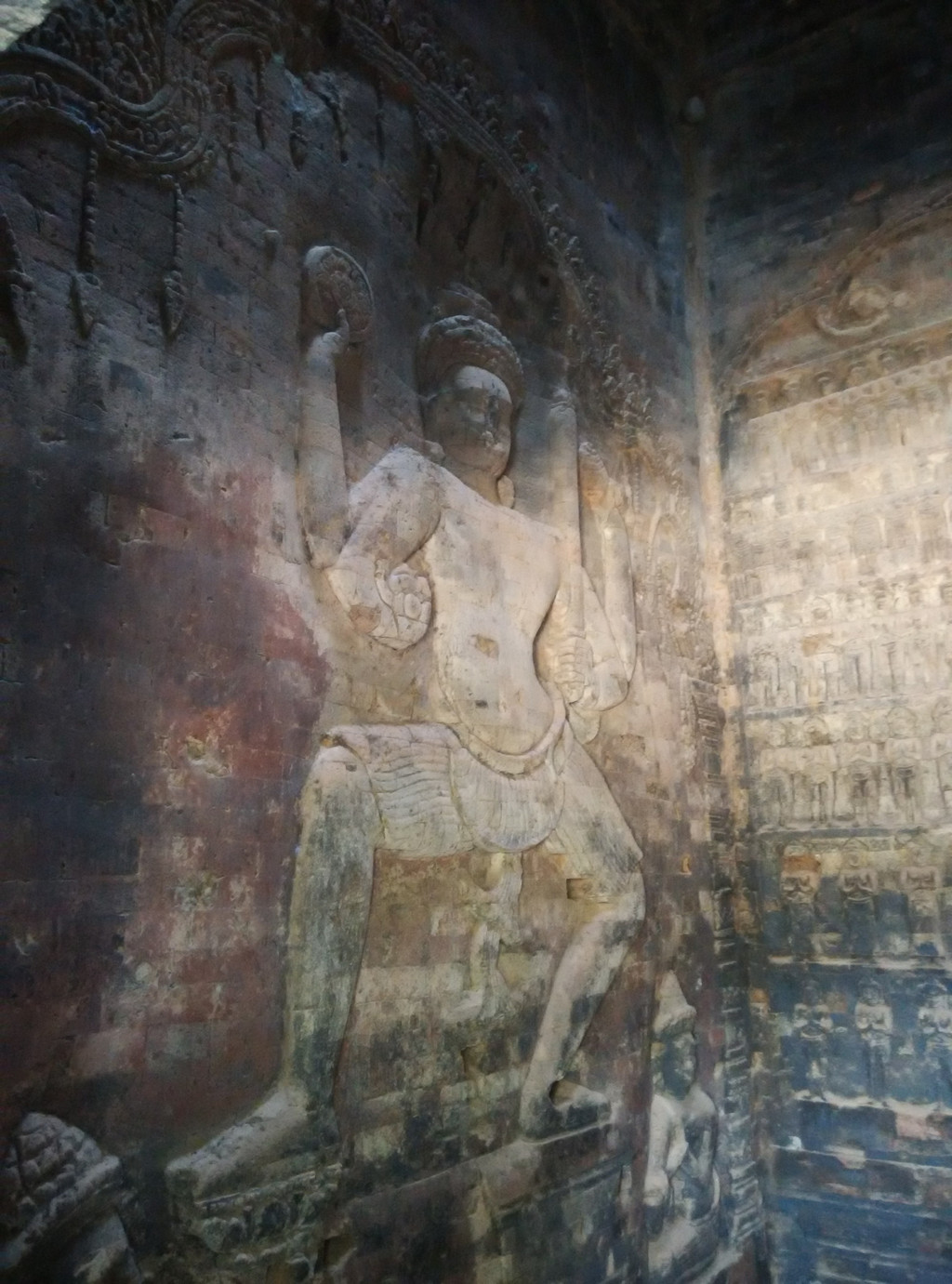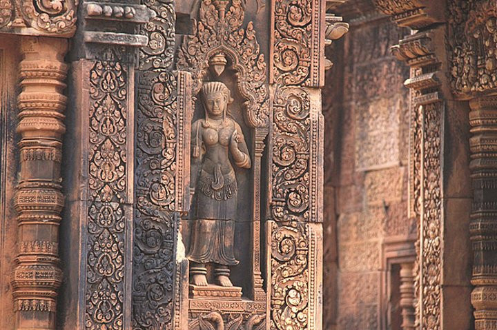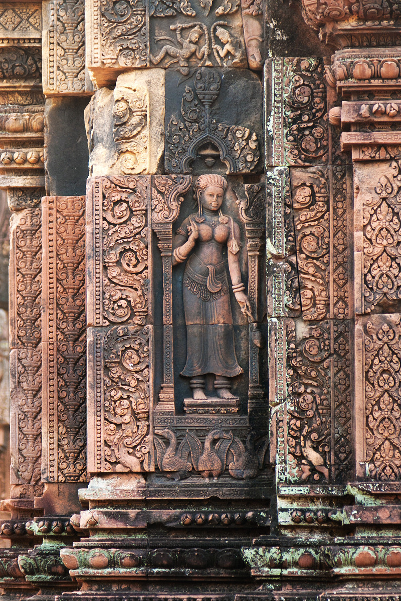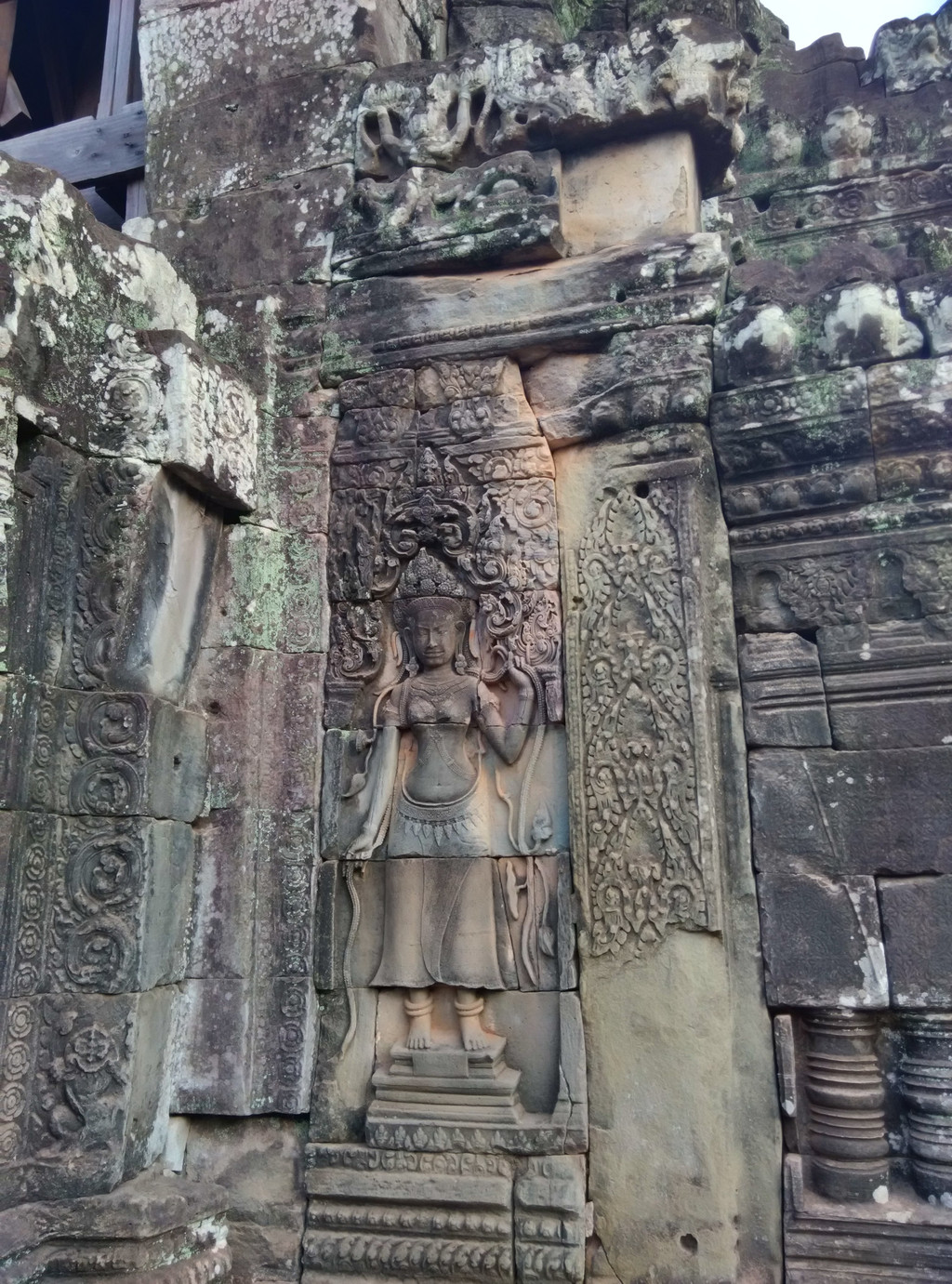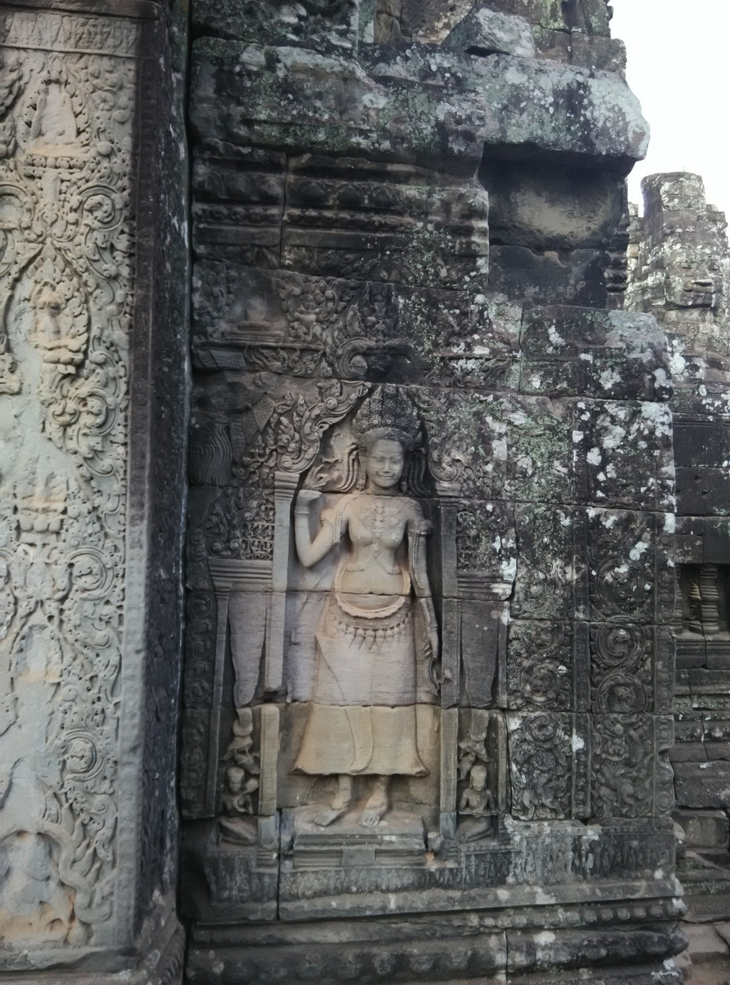 这里最为美丽的浮雕是位于三座神殿外墙上的仙女浮雕像,这些浮雕处理得非常精致,富有强烈的立体感。仙女们的姿势和表情虽然各不相同,但都有着优美大方的迷人风度。她们装束大致相同,腰部裹着长至脚踝的纱裙,不过双臂会摆出不同的姿势,体态十分优美。头上插着各种各样的花饰,耳朵上戴有样式复杂的耳环,肚子上挂着长长的脐链,腰间系着镶嵌有宝石的腰带,手腕和脚腕上还各佩着两个手环和脚环。仙女们的表情安详、宁静,还带着一丝淡淡的微笑,被誉为是“东方的蒙娜丽莎”。可惜核心部分现在都被围起来了,只能远远地膜拜一下。
