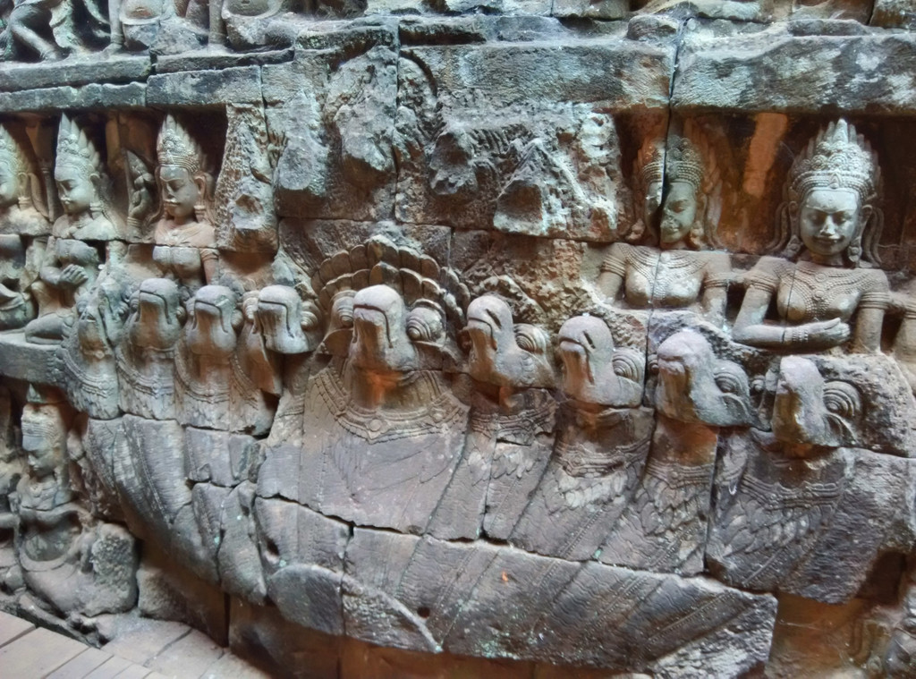 “搅动乳海”这个史诗故事是吴哥文明世界观的重要组成部分,并为吴哥的建筑艺术提供了源源不断的题材和灵感,在吴哥窟中有大量体现。吴哥王朝历史上颇具传奇色彩的国王阇耶跋摩七世信仰大乘佛教(主张普度众生),但在他兴建的大吴哥城、圣剑寺的入口石桥都采用了天神和阿修罗拉拽七头蛇的石雕装饰。在崇拜毗湿奴的国王苏耶跋摩二世兴建的吴哥寺中,更是有数十米篇幅的浮雕洋洋洒洒地讲述了“搅动乳海”的故事,吴哥寺的路拦也采用了七头蛇装饰,这个符号在吴哥的建筑中被大量运用,几乎随处可见。