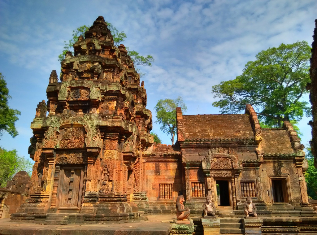 在柬埔寨的吴哥地区,有着上千座古文明遗迹,其中有一座距离吴哥城约25公里,远看似火般红艳的神庙最为独特,原名为班蒂斯蕾,柬埔寨文原意是“谋求幸福” 的意思,现在人们习惯称这儿为“女王宫”。