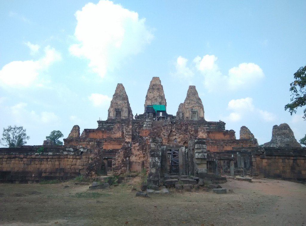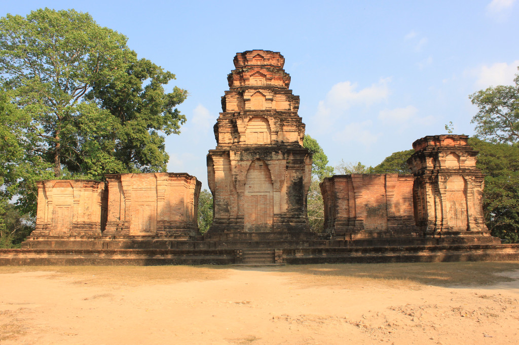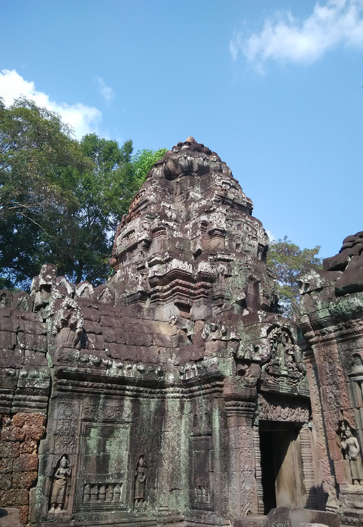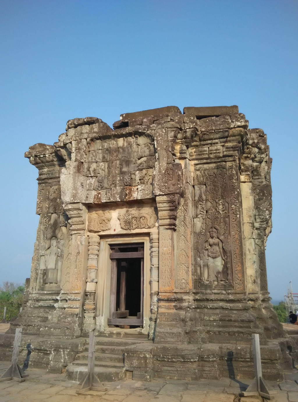 这个寺很小,而且残破不全,当初法国人发现它时已坍塌成一个砖堆,他们以极大的耐心,一砖一砖重新搭建起来。残存的砖块不够用时,不得已用新砖代替,新砖上就会刻着缩写“CA”(Conservation Angkor)以示区别。