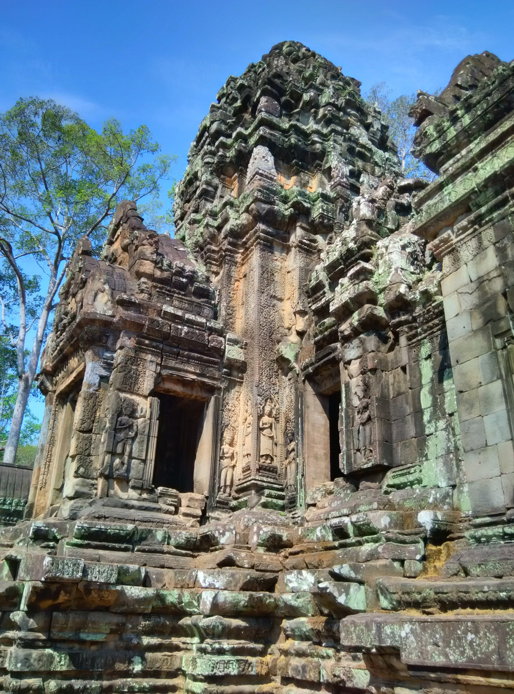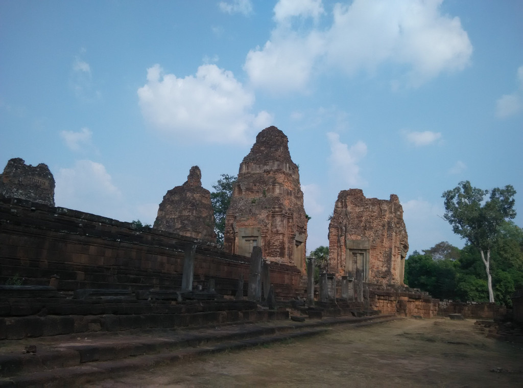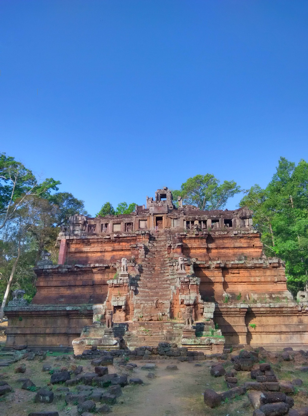 这个寺很小,而且残破不全,当初法国人发现它时已坍塌成一个砖堆,他们以极大的耐心,一砖一砖重新搭建起来。残存的砖块不够用时,不得已用新砖代替,新砖上就会刻着缩写“CA”(Conservation Angkor)以示区别。