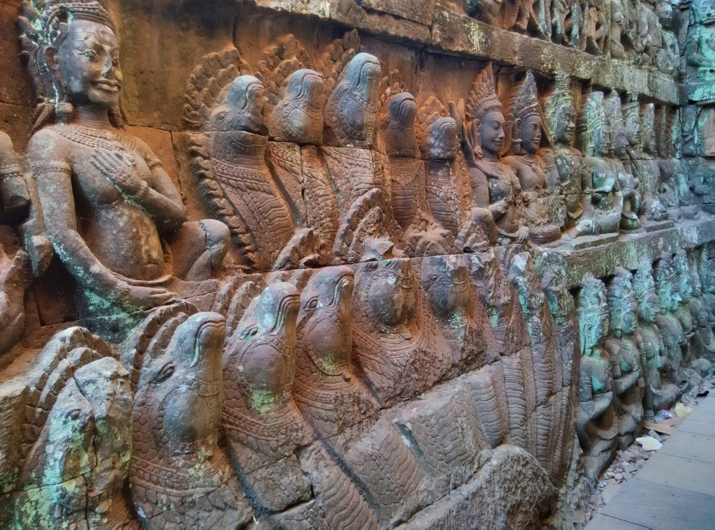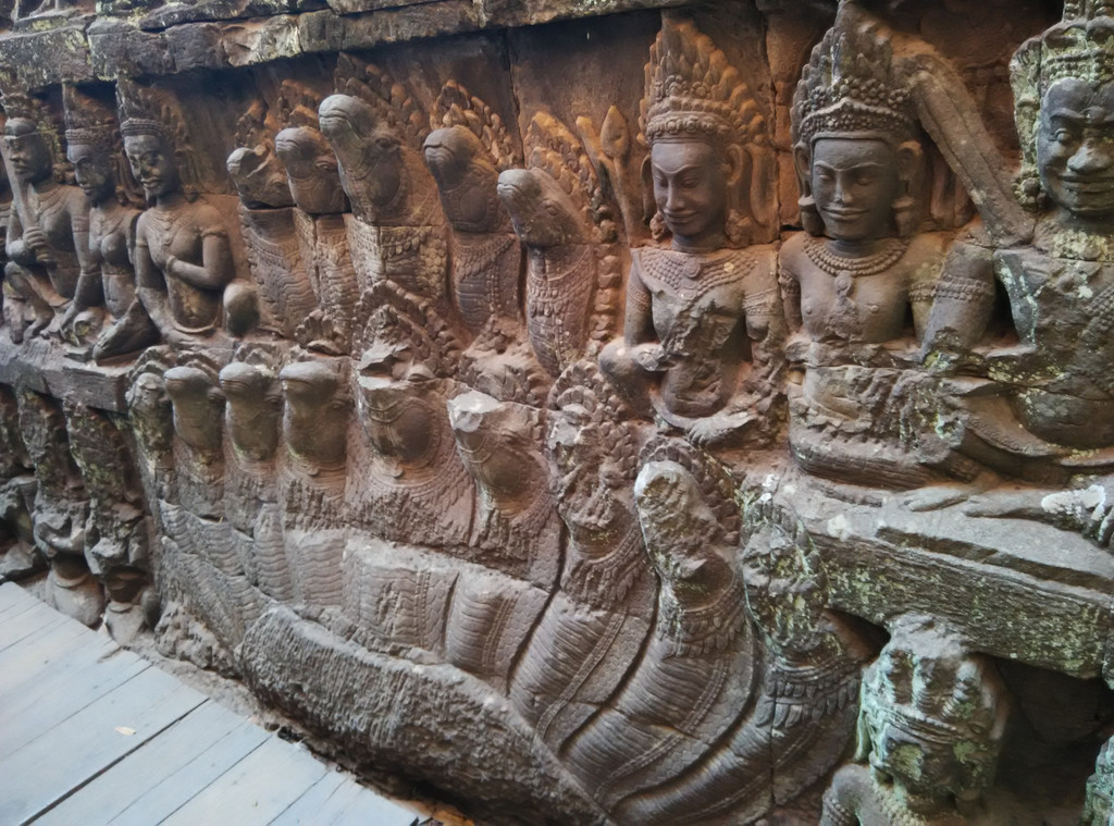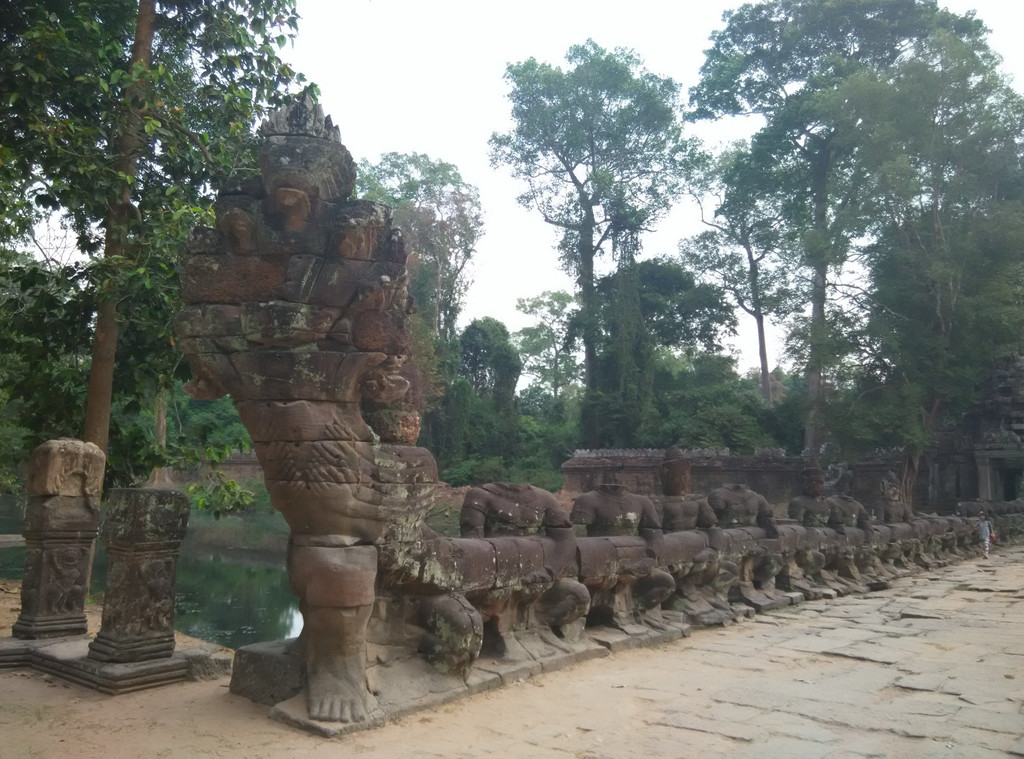 圣剑寺犹如一座小型的吴哥王城,城门前也有护城河,护城河长堤上是两排象征天神与阿修罗的石雕,合力拉着七头那迦在“搅动乳海”。
