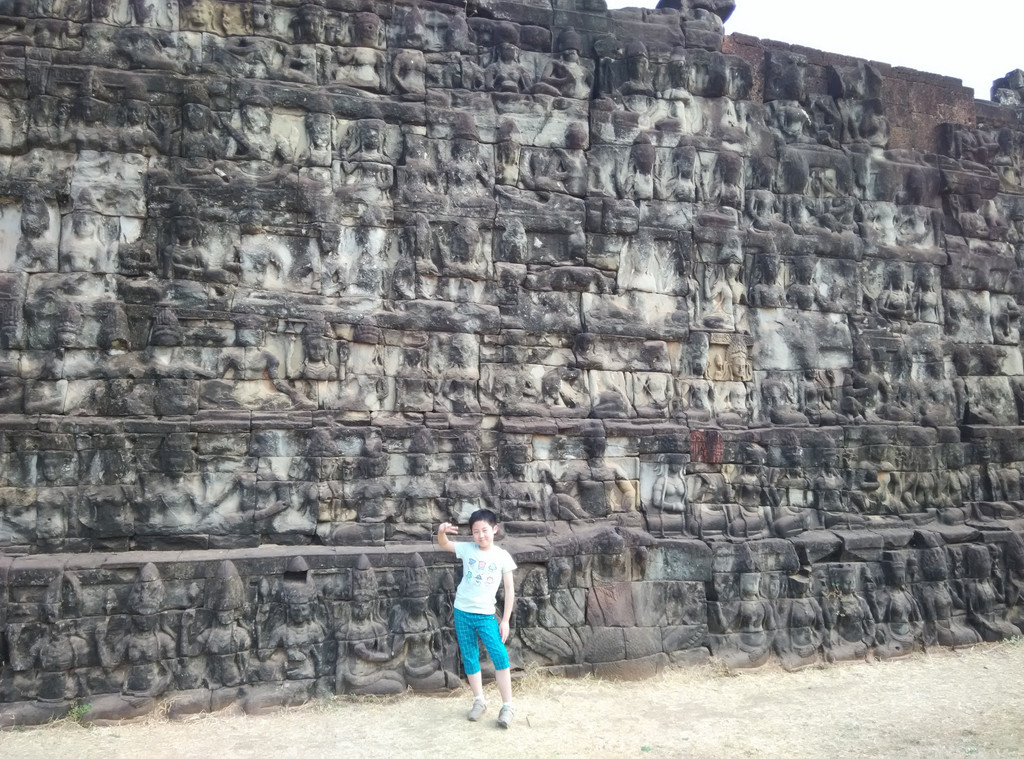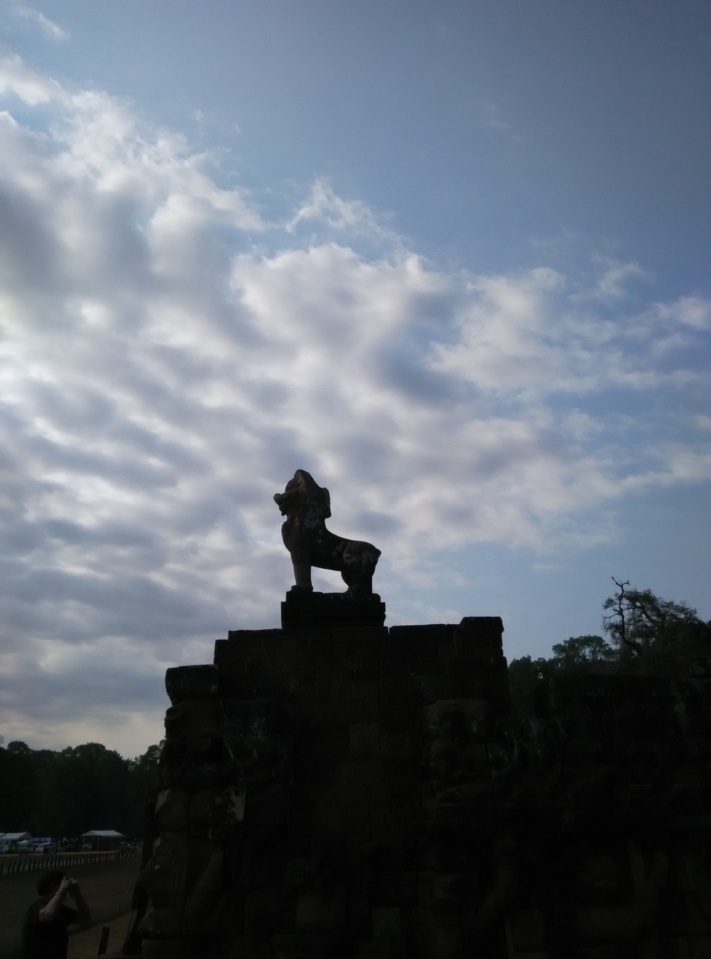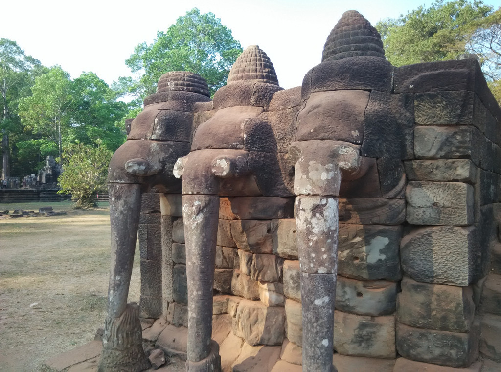 战象平台也叫斗象台,位于王宫前面,长达350米,正对着的是从胜利之门延伸过来的大道,也被称为国王的平台。当时,从战场上凯旋的将士们就在这里接受国王的接见,同时,这里也是迎接邻国国王的场所。值得一看的是平台北侧的岩石上刻着拥有三个头颅的巨象雕像,其三条采摘荷花的鼻子如同三根柱子。