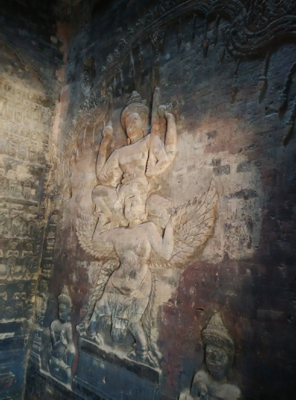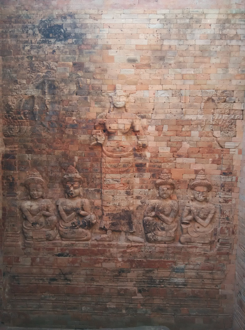 还有一大亮点是特有的红砖浅浮雕。这座印度教寺庙是吴哥窟最小的寺庙之一,却是吴哥窟砖雕的代表。这座寺庙供奉的是毗湿奴大神,在中央尖塔的内部雕刻了以毗湿奴为题材的浮雕,在最北侧的尖塔内部能看到毗湿奴的妻子拉克希米的立像。