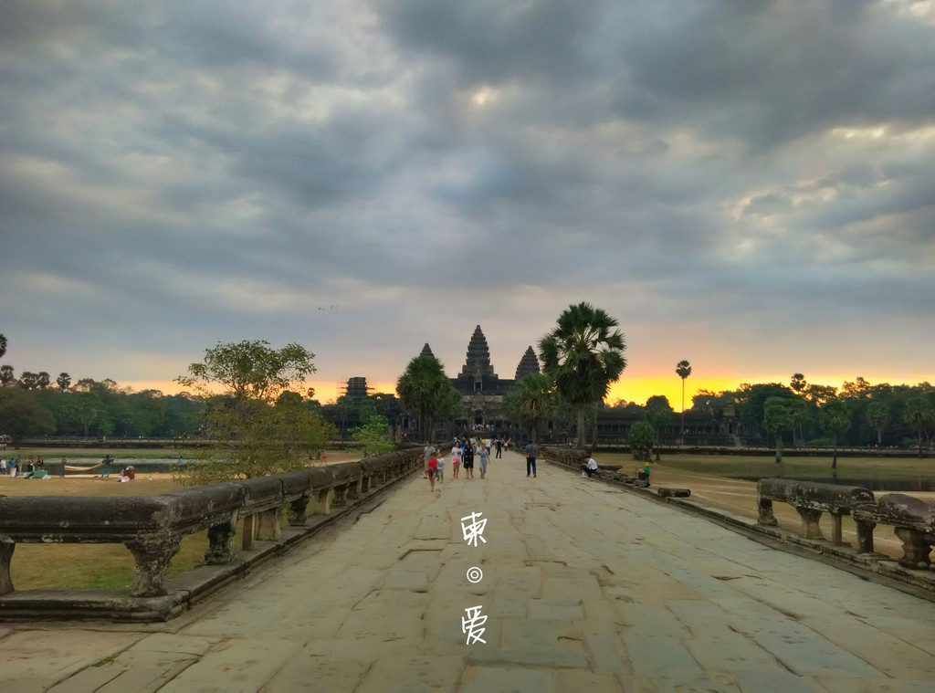 吴哥寺(即小吴哥,Angkor Wat)的日出历来为世人推崇,享有很高的声誉。于是,我们老清老早四点多就起床,让司机带我们去吴哥寺了。天还没亮,路灯也没有,路上却已有不少志同道合的同行人了。到了吴哥寺门口才发现,早有大队人马聚集于此。在到达吴哥寺主体建筑前还有长长的通道要走,两边没有栏杆,也没有路灯,全靠手机自带的手电筒微弱发光,照亮路面。前前后后的人很多,大家都心照不宣地低头赶路,没有喧哗,也没有大惊小怪,就像朝圣的人们都为了同一个信仰而来。