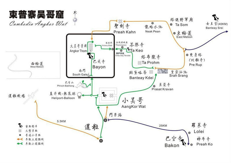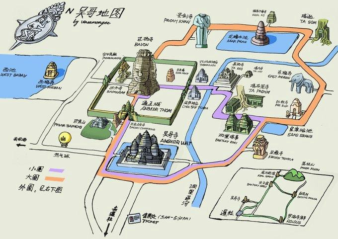 去过吴哥窟的都知道,游览分小圈、大圈和外圈(见下图)。而实际上司机在带我们转圈的时候也并非完全按照这种圈圈来走,除了外圈因为距离比较远,与中心区域没有什么交集,小圈和大圈就并不是区分得那么严格了,反正把我要去的那些寺庙告诉司机,让他自由安排,只要那几个重要的寺庙都圈到即可。