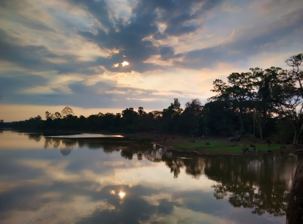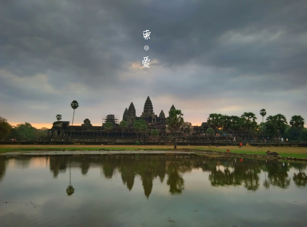 拍照的最佳位置在主体建筑右前方的一片水塘边,这样拍出来的照片里不仅有吴哥寺有日出,还有水塘里的倒影,怎么拍怎么美。此时的天空还是一片漆黑,水塘边却已被黑压压的人群包围了,前几排根本挤不进去,只能往后站。