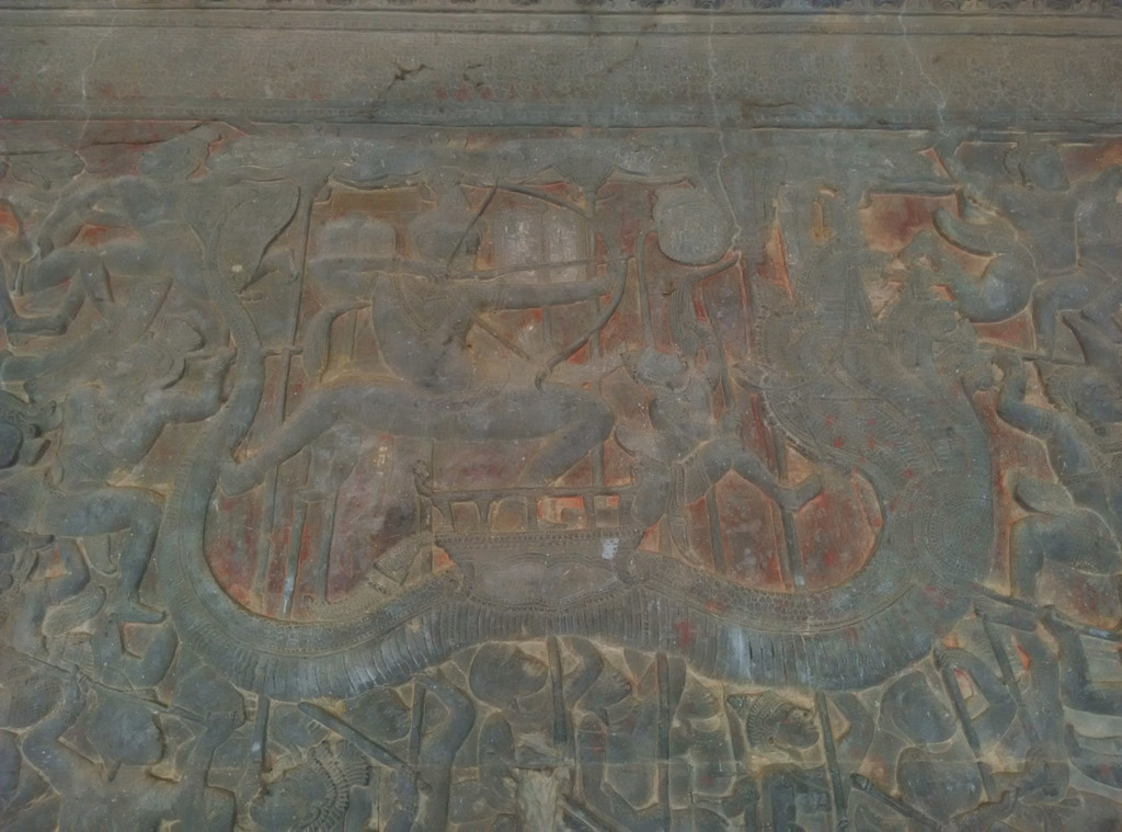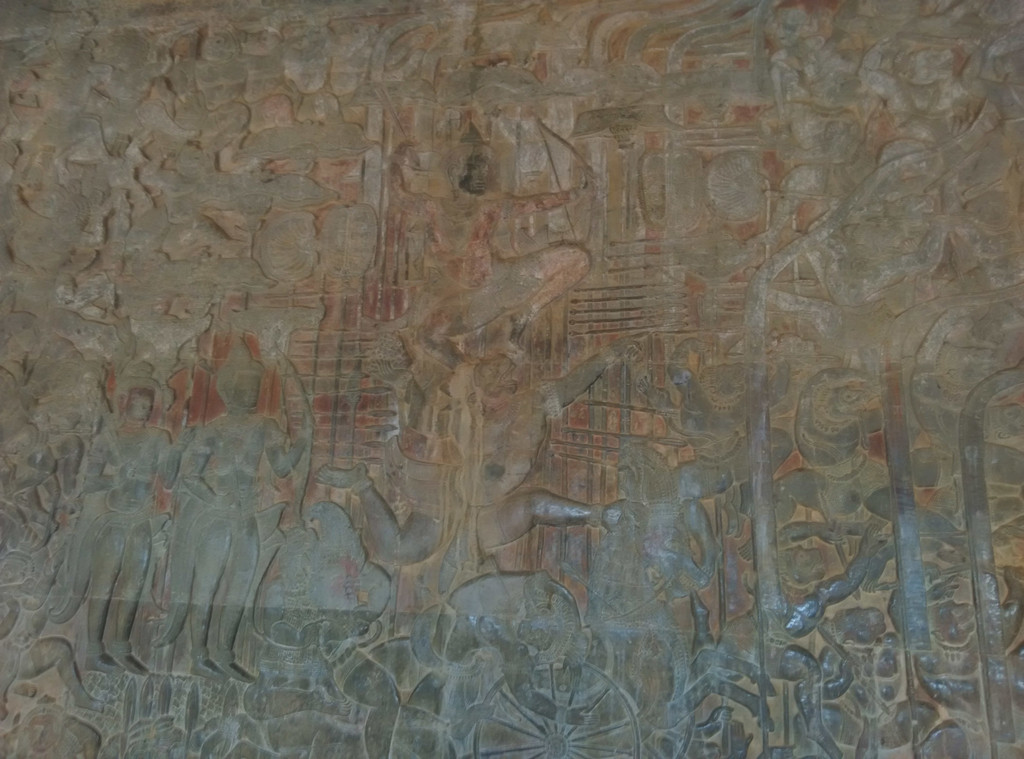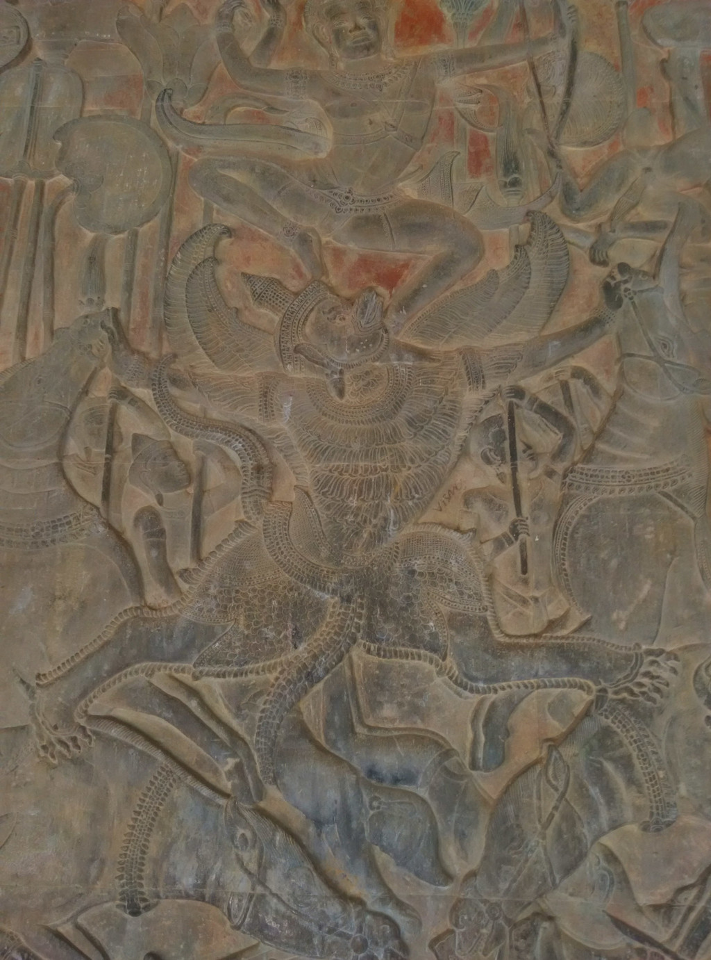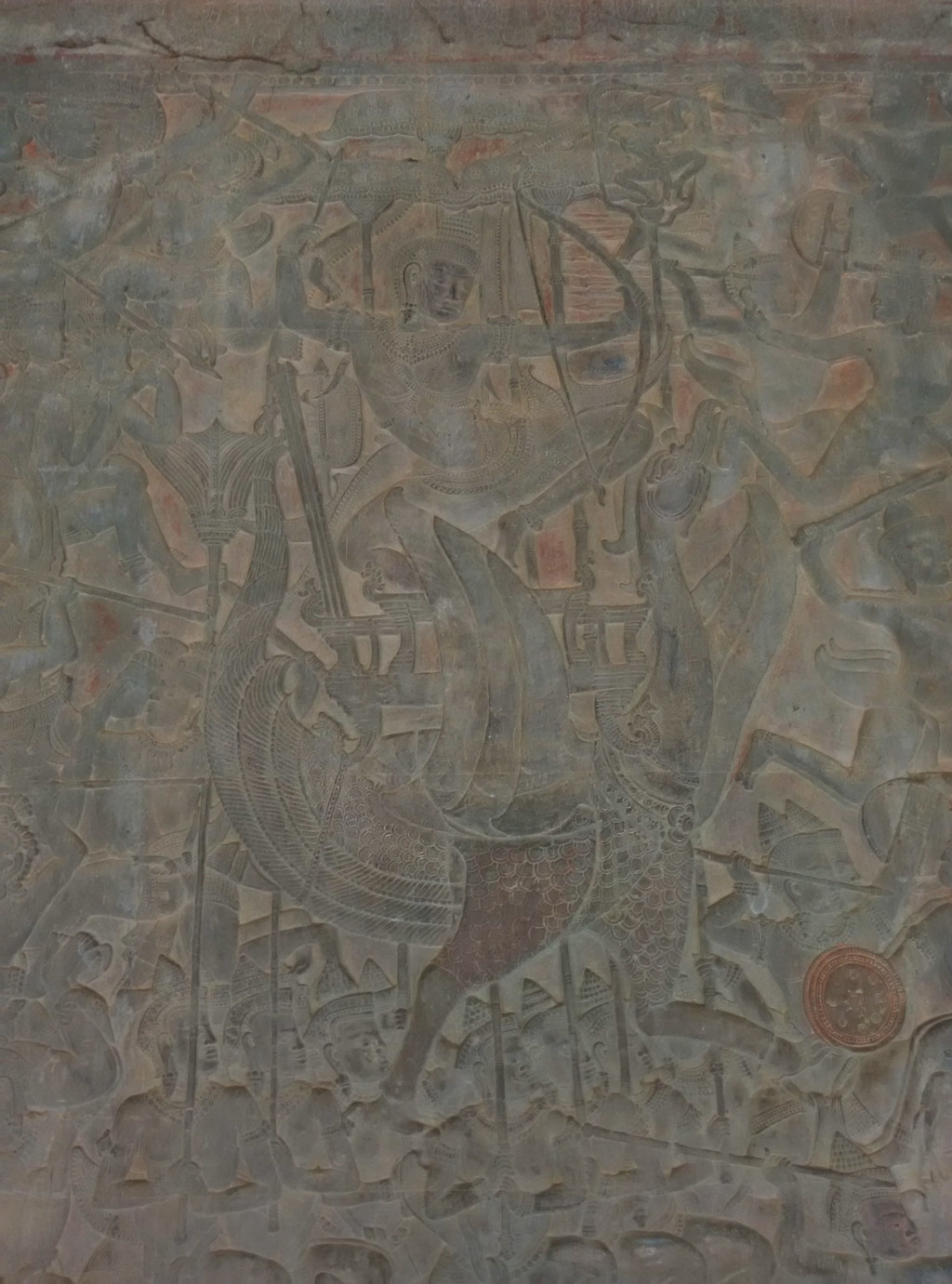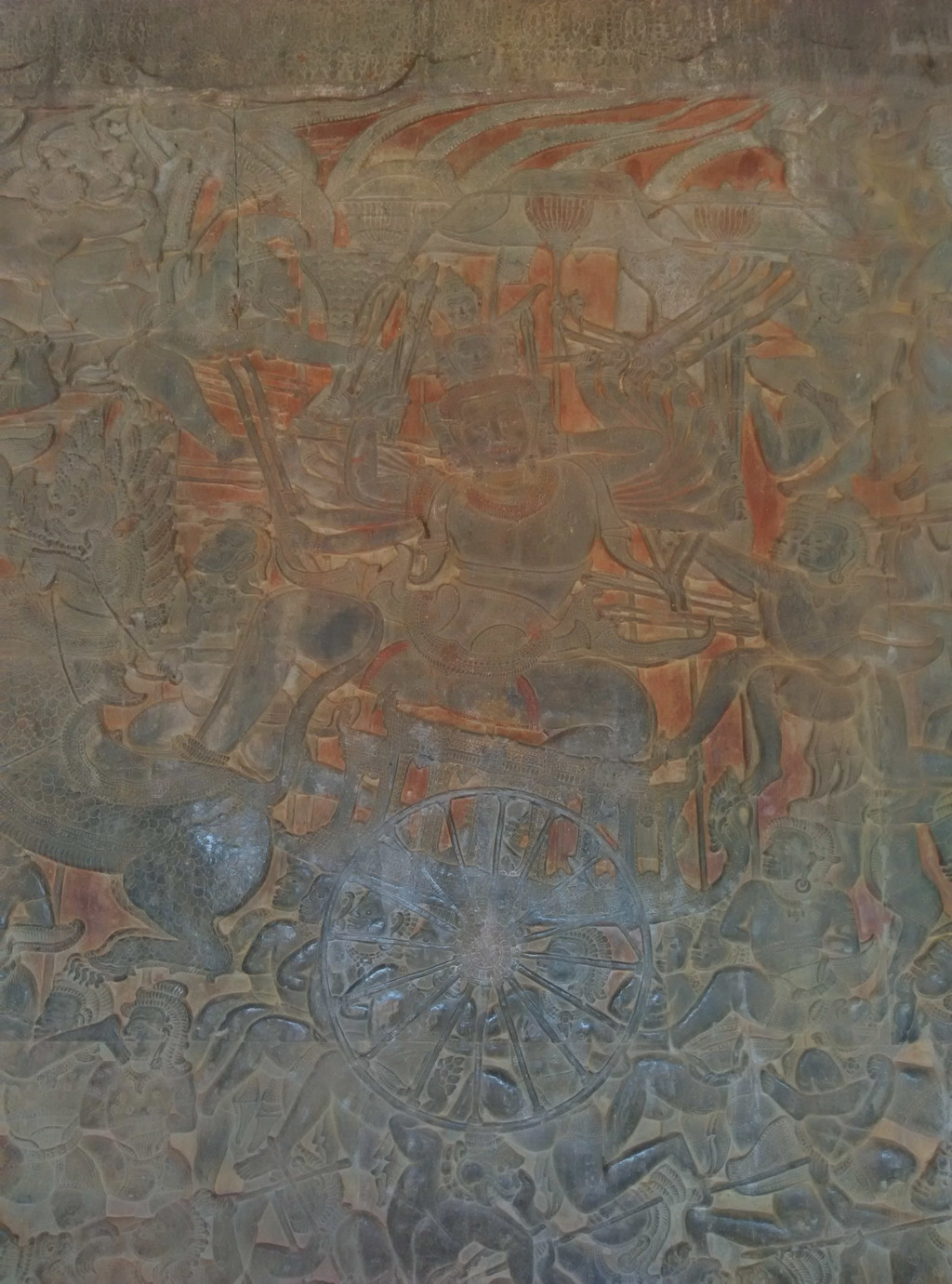 吴哥寺外层回廊的浅浮雕中最著名的就是印度神话“搅动乳海”。居中手持法器盘坐的是毗湿奴,左边是88名阿修罗,右边是92名天神。毗湿奴的化身海龟库尔马的脑袋面向阿修罗一侧,龟背上驮着曼荼罗山,毗湿奴盘坐在曼荼罗山上。蛇族之王婆苏吉缠绕着曼荼罗山,做为搅海的绳索。海里鱼虾鳄鱼翻滚,搅海造成大量海洋生物成为牺牲品。随着浪花飞溅,女神(Apsara)在乳海中产生,飞翔于空中。