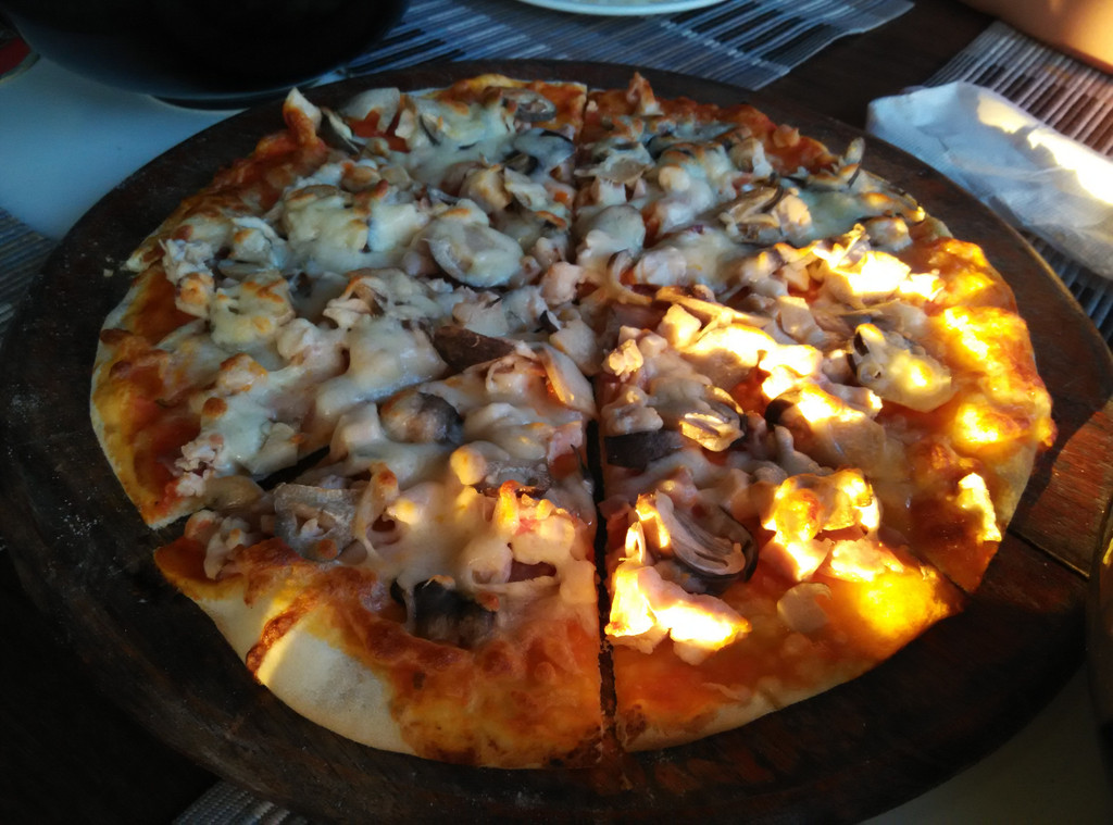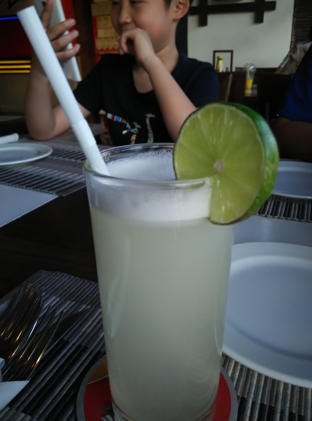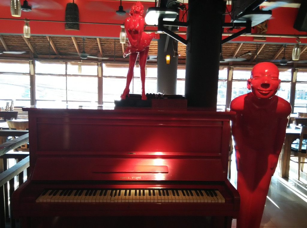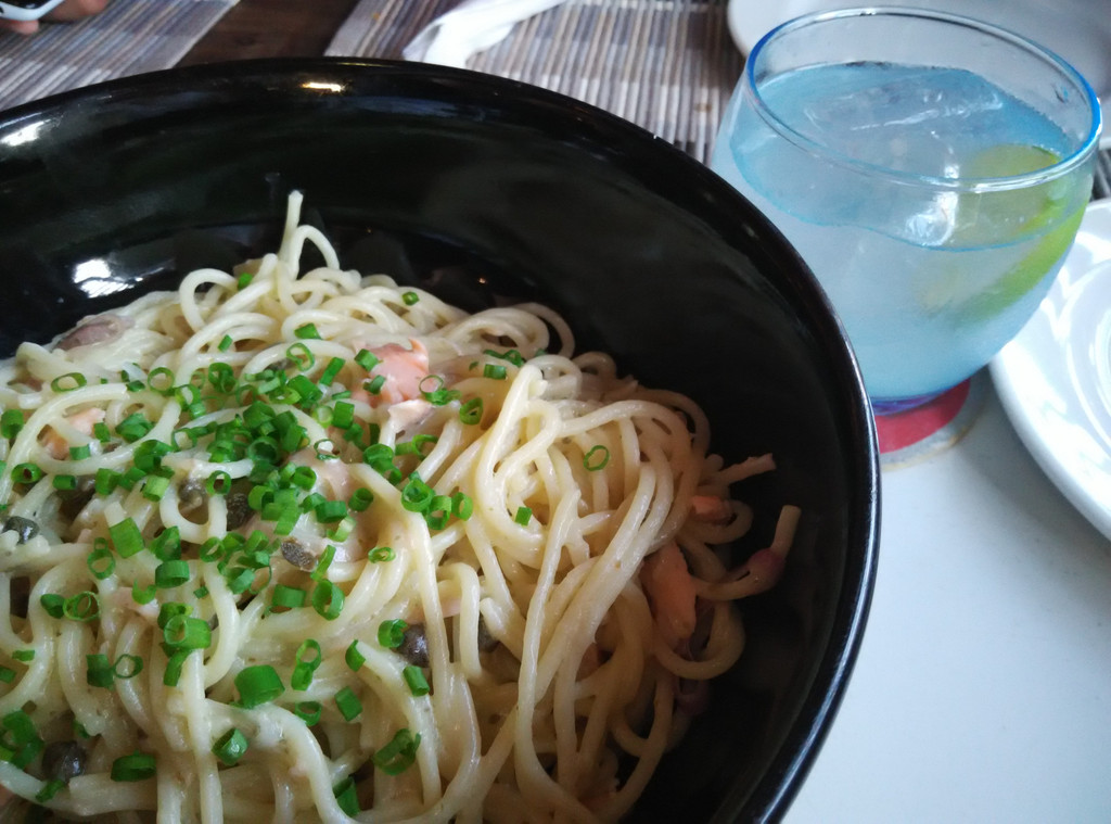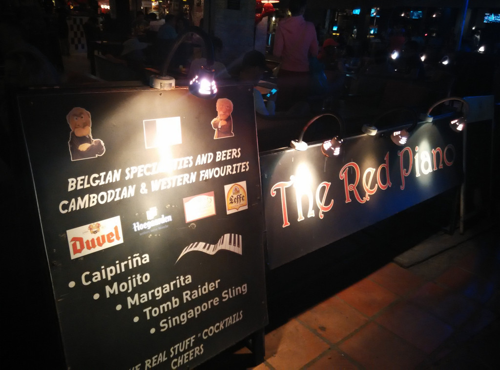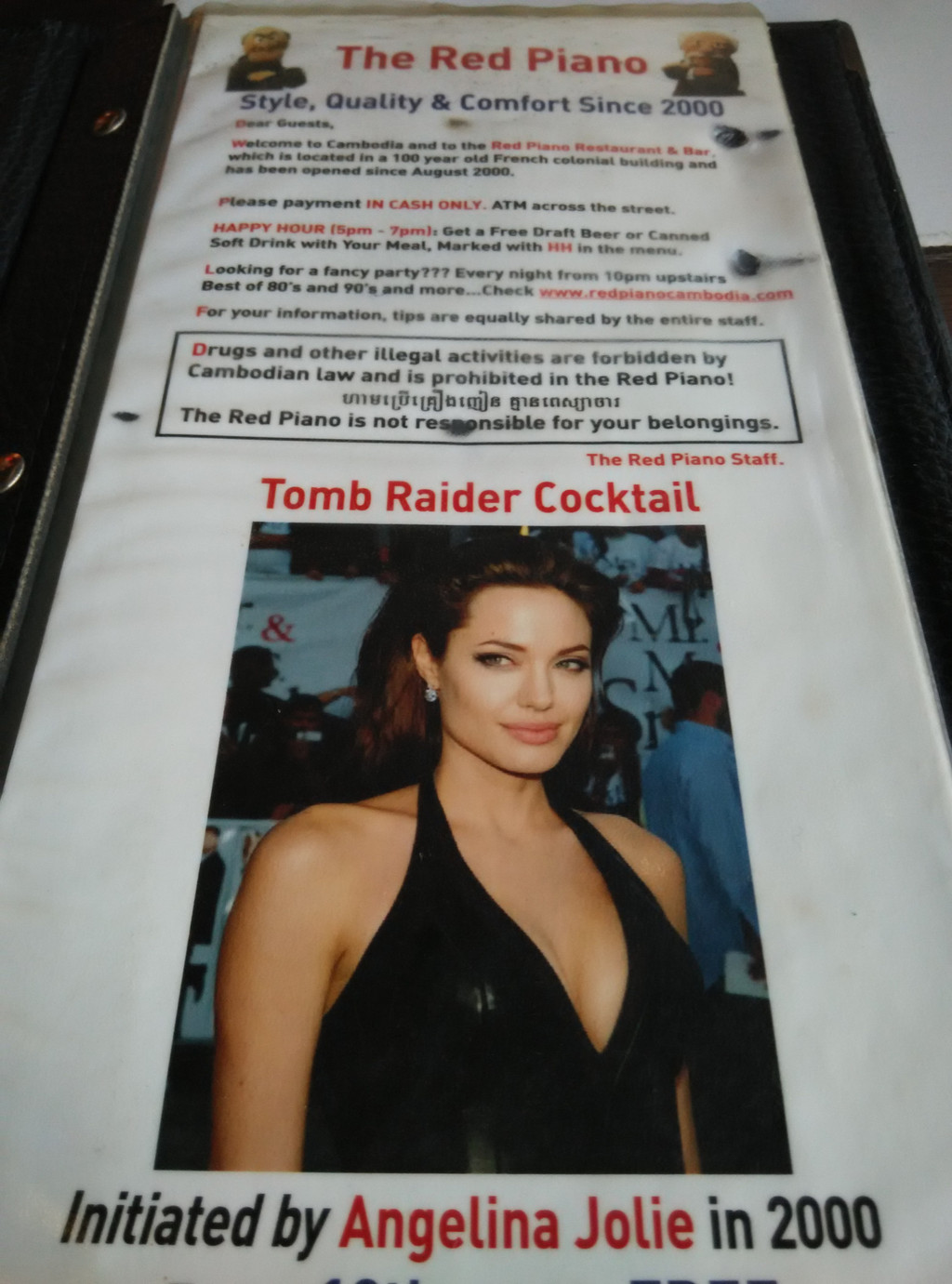 由于回程航班是晚上11点左右的,所以还有足够的时间吃晚饭,纠结了半天还是去了大名鼎鼎的红钢琴酒吧(Red Piano),这是当时《古墓丽影》女主安吉丽娜·朱莉在暹粒拍电影时用餐的地方,她还亲自调制了一杯“古墓丽影”鸡尾酒,红钢琴酒吧因此而大红大火,许多人慕名到此,这款鸡尾酒也被加入了酒吧的推荐菜单。我们也不可免俗地点了这款鸡尾酒,还有意面和披萨,味道倒还不错。完美结束了这趟柬埔寨之行。